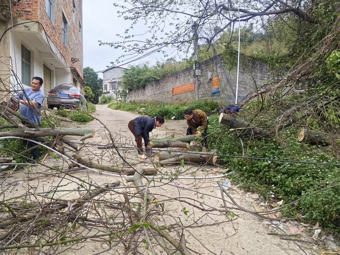坚守一线解民忧,清晨清障保通行。在等待专业力量的过程中,村“两委”工作人员始终坚守现场,密切关注险情变化。次日清晨,工作人员便再次集结现场,主动承担起倒伏树木的清理工作。大家手持锯子、柴刀等工具,分工协作修剪枝条、搬运树干,经过数小时的全力奋战,成功将道路上的树木全部清理干净,彻底打通受阻的道路,为村民日常出行恢复了安全保障。