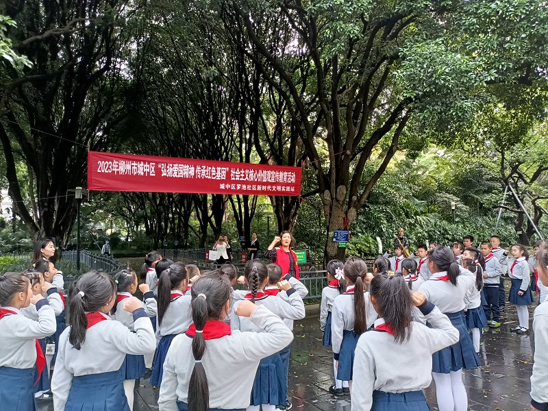 (城中区公园街道办事处讯 通讯员吴卓霞报道)为深入贯彻习近平新时代中国特色社会主义思想,贯彻落实党的二十大精神,践行社会主义核心价值观,加强未成年人党史学习教育力度,教育引导未成年人厚植爱国主义情怀,传承红色基因,充分发挥“五老”志愿者服务青少年作用。近日,城中区罗池社区组织辖区未成年人学生在柳侯公园开展“弘扬爱国精神,传承红色基因”核心价值观教育活动。
