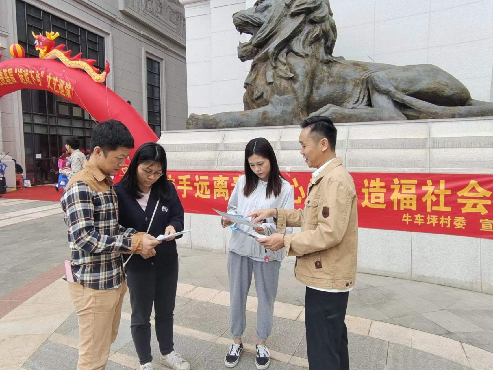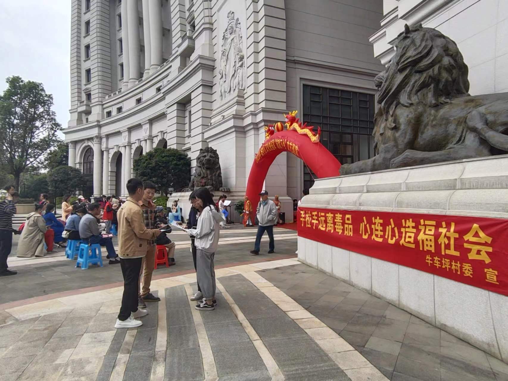 (城中区河东街道讯 牛车坪村 欧俊 杨天文摄影报道)为普及禁毒知识,遏制毒品蔓延,加强禁毒宣传力度,提高群众的毒品防范能力和禁毒意识。5月23日,牛车坪村以城中区文化进基层“送戏下乡”文艺汇演为契机在鑫中联大厦开展禁毒宣传活动。