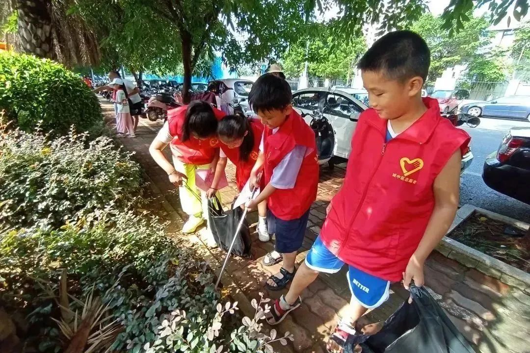活动中,小志愿者们在社区工作人员的带领以及家长的陪护下,身穿红马甲,拿着钳子、垃圾袋等工具,沿着街道路两旁拾捡草坪和道路两旁的废弃物、纸巾、果皮、食品袋等各类垃圾。大家干劲十足,有的清理草坪,有的打扫卫生死角,有的捡拾人行道上的垃圾。孩子们分工明确、齐心协力,忙得热火朝天。同时,他们还化身为小小宣传员,并向过往行人发放防溺水宣传资料,虽然汗水打湿了衣襟,但浇不灭他们心中的那份热情。通过“小手”和“大手”的合作,恒大华府周边的环境也焕然一新,路过的居民纷纷竖起了大拇指。