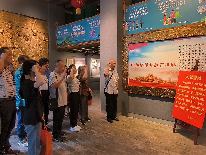 活动当天上午,虽然天空不作美,大家依然热情高涨来到柳州联华印刷厂旧址参观学习。参观前,大家在老党员黄汝勤同志的带领下,举起右拳,用铿锵有力的声音重温入党誓词,用铮铮誓词宣示对党的忠诚和信仰。宣誓结束后,在讲解员的带领下,大家认真参观了联华印刷厂旧址陈列馆“城市、星火、史画”三个展览部分,学习了柳州建城史、中共柳州地下党奋斗史,深刻感受地下党员在腥风血雨中,不屈不挠、勇于抗争的精神,深切缅怀在解放战争中英勇献身的中共地下党英烈和所有为解放战争作出贡献的人们。