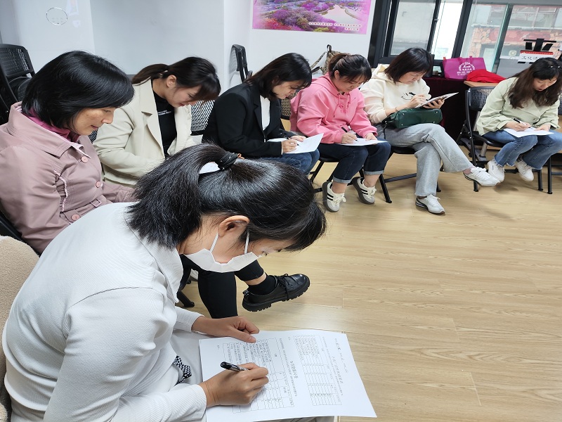 覃老师以“正念”为主题,围绕“关注自身”与“摒除杂念”,给社区工作人员带来了一场精彩的心理沙龙活动。活动中,大家围坐成圈,在覃老师轻声低语的引导下,配合着轻柔舒缓的背景音乐,大家缓缓闭上眼睛进入冥想状态,全身心融入到放松的氛围里,冥想结束后,覃老师以互动的方式让大家释放负面“情绪”,提醒自己、珍视自己、关爱自己。最后,每个人都填写了一份调查问卷,覃老师结合问卷结果与大家探讨了基层工作人员应该以怎样的心态对待工作,如何克服日常中的心理困惑。