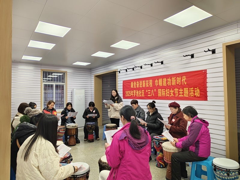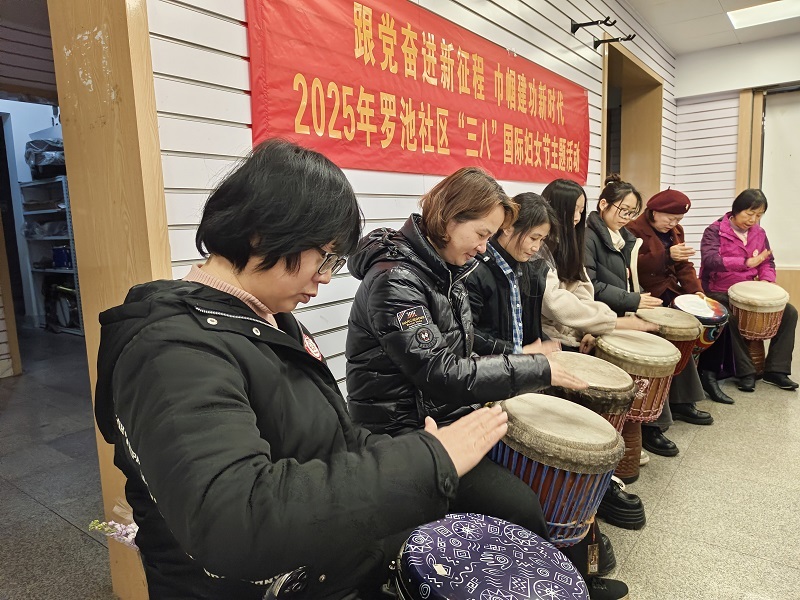 活动在“跟党奋进新征程 巾帼建功新时代”主题宣讲中拉开帷幕。社区妇联主席叶芬同志以生动的语言和真实的案例,阐述了新时代女性在各个领域的重要贡献,激励广大女同志在新征程上积极作为,赢得了现场阵阵掌声。随后,社区妇联组织学习了预防未成年人犯罪家庭保护手册。通过学习,提高女性作为母亲或家庭成员在未成年人教育和保护方面的意识与能力,大家认真聆听、积极交流,深刻认识到家庭在预防未成年人犯罪中的重要作用。经典诵读《三字经》环节更是充满了文化韵味,大家在诵读过程中,重温中华传统文化的魅力,感受其中蕴含的智慧和力量,现场书声琅琅,氛围热烈。非洲鼓学习体验活动将整个活动推向了高潮。在专业老师的指导下,女同志们从最初的手忙脚乱到逐渐掌握节奏,欢快的鼓点在活动室中回响。大家沉浸其中,在轻松愉悦的氛围中释放压力、放松心情。
