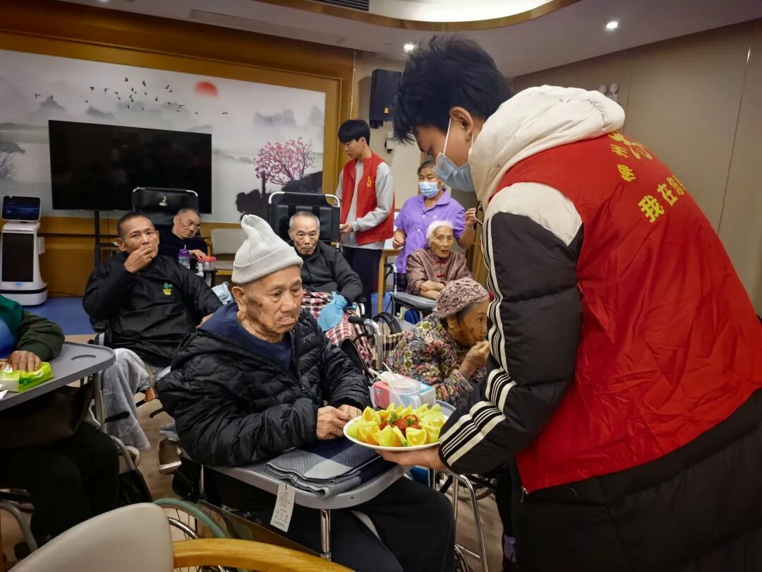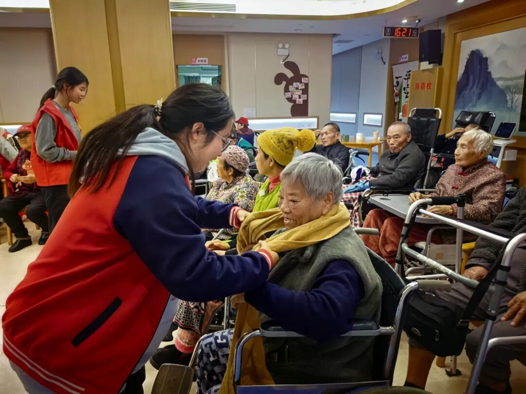 活动当天,青年志愿者们带着自己精心准备的礼物来到养老院。这些礼物中,是志愿者们用自己的零花钱购置的保暖围巾和新鲜水果。在养老院的活动室里,志愿者们围坐在老人身边,为他们系上柔软的围巾,将切好的水果一一递到手中,一句句贴心的问候、一个个温暖的举动,让老人们的脸上洋溢起幸福的笑容。志愿者们还与老人促膝长谈,倾听他们的生活故事,了解他们的健康状况和实际需求,现场气氛温馨而融洽。带队老师也为老人们送上了精心准备的大礼包,祝愿老人们身体健康、福寿绵长。