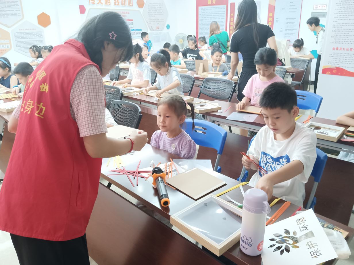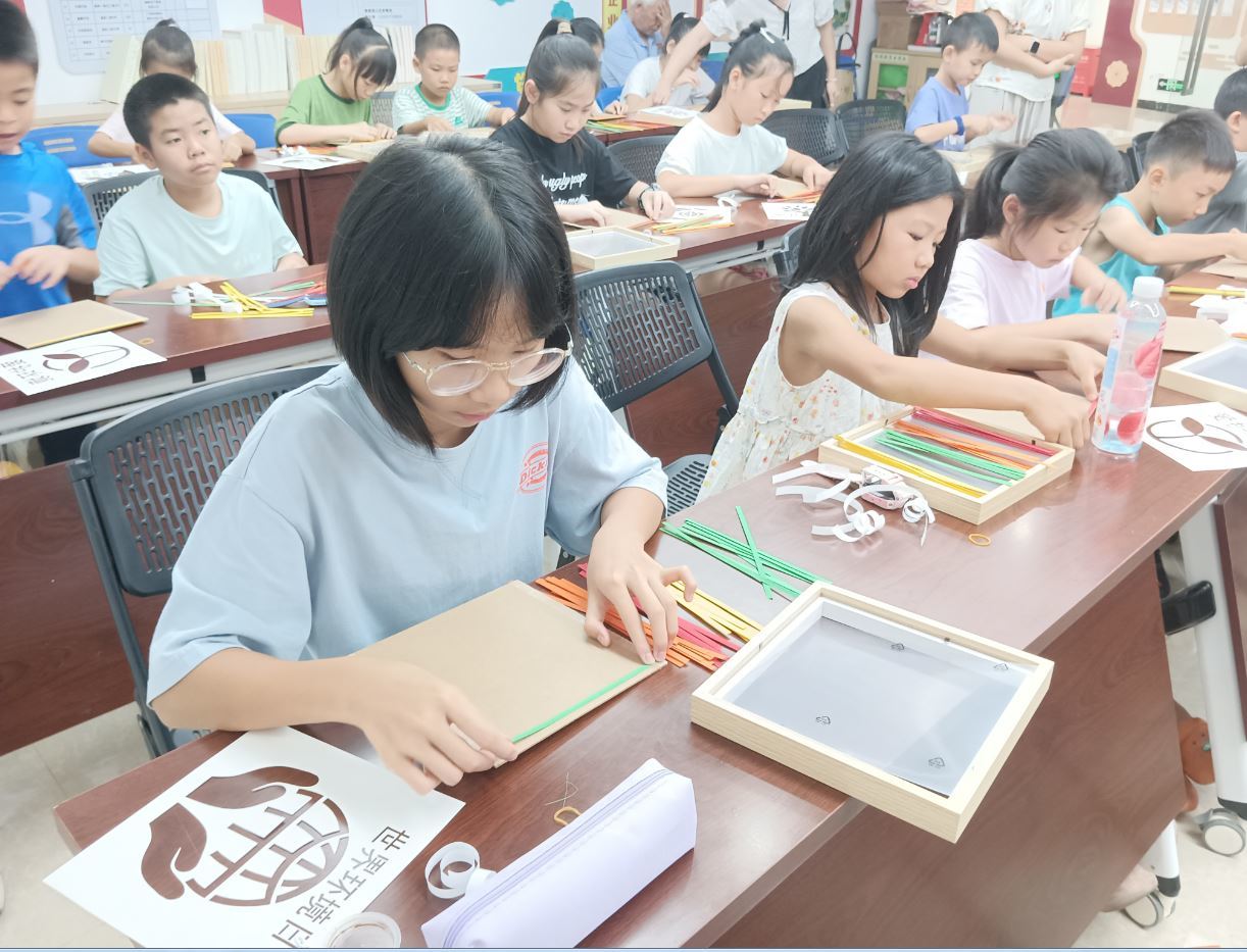 活动开始,工作人员讲述竹编画的历史、工艺、文化内涵、在新时代的传承故事以及展示融入现代文明元素的竹编画作品,让青少年感受非遗在新时代的创新发展。随后,工作人员示范竹编画基本制作方法,志愿者在旁协助分发材料、指导操作,融入垃圾分类、文明出行、节约资源等新时代文明实践元素,如编织“文明分类垃圾桶”“绿色地球”等图案。