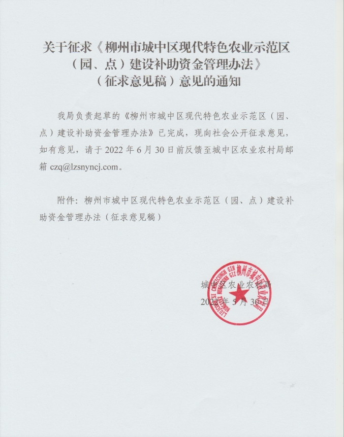 我局负责起草的《柳州市城中区现代特色农业示范区(园、点)建设补助资金管理办法》已完成,现向社会公开征求意见,如有意见,请于2022年6月30日前反馈至城中区农业农村局邮箱czq@lzsnyncj.com。