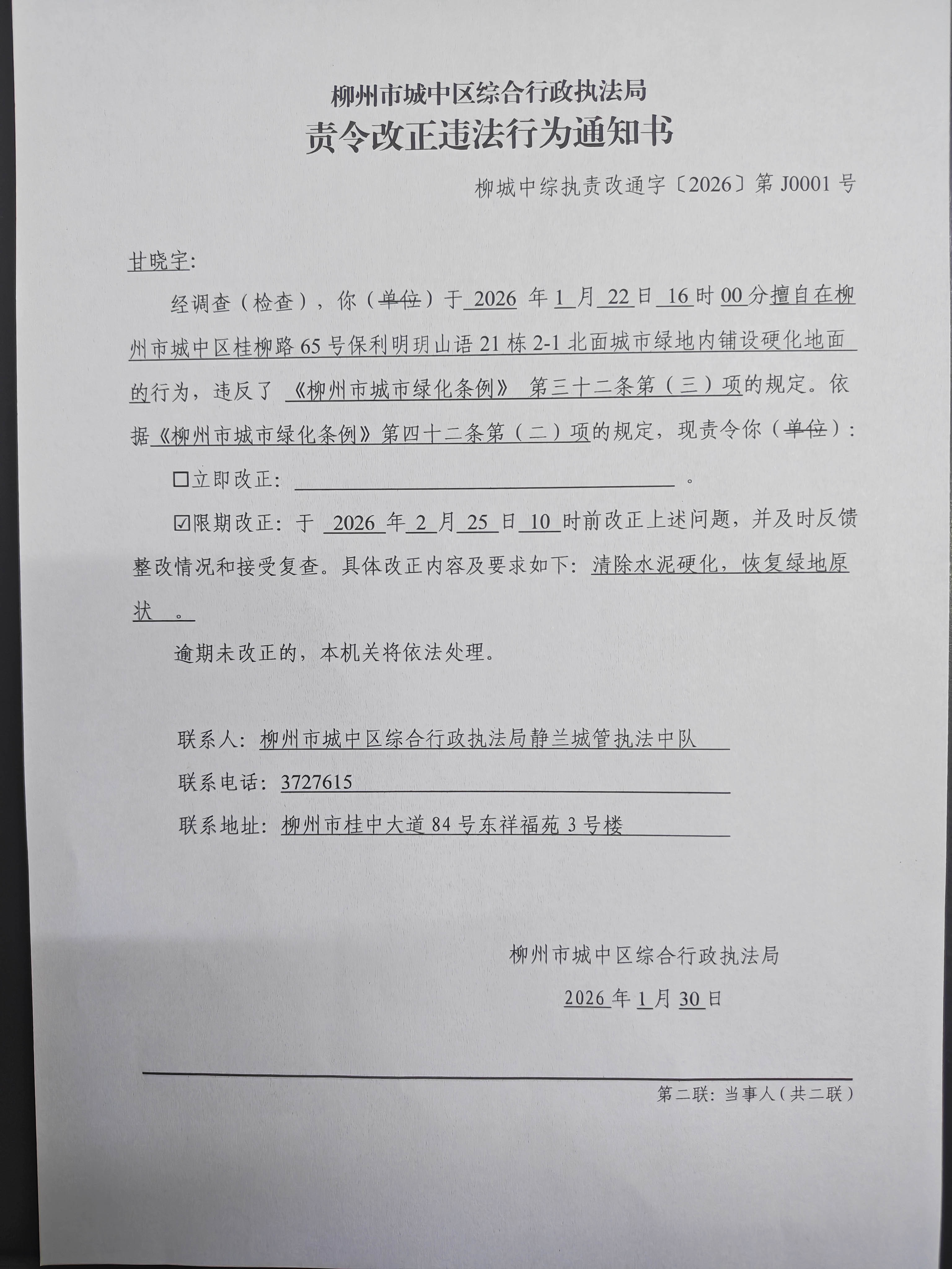 我局于2026年1月30日作出了《柳州市城中区综合行政执法局责令改正违法行为通知书》(柳城中综执改通字〔2026〕第J0001号),内容如下:经调查(检查),你(单位)于2026年1月22日16时00分擅自在柳州市城中区桂柳路65号保利明玥山语21栋2-1北面城市绿地内铺设硬化地面的行为,违反了 《柳州市城市绿化条例》第三十二条第(三)项的规定。依据《柳州市城市绿化条例》第四十二条第(二)项规定,现责令你(单位):限期改正:于2026 年2月25日10时前改正上述问题,并及时反馈整改情况和接受复查。具体改正内容及要求如下:清除水泥硬化,恢复绿地原状。逾期未改正的,本机关将依法处理。