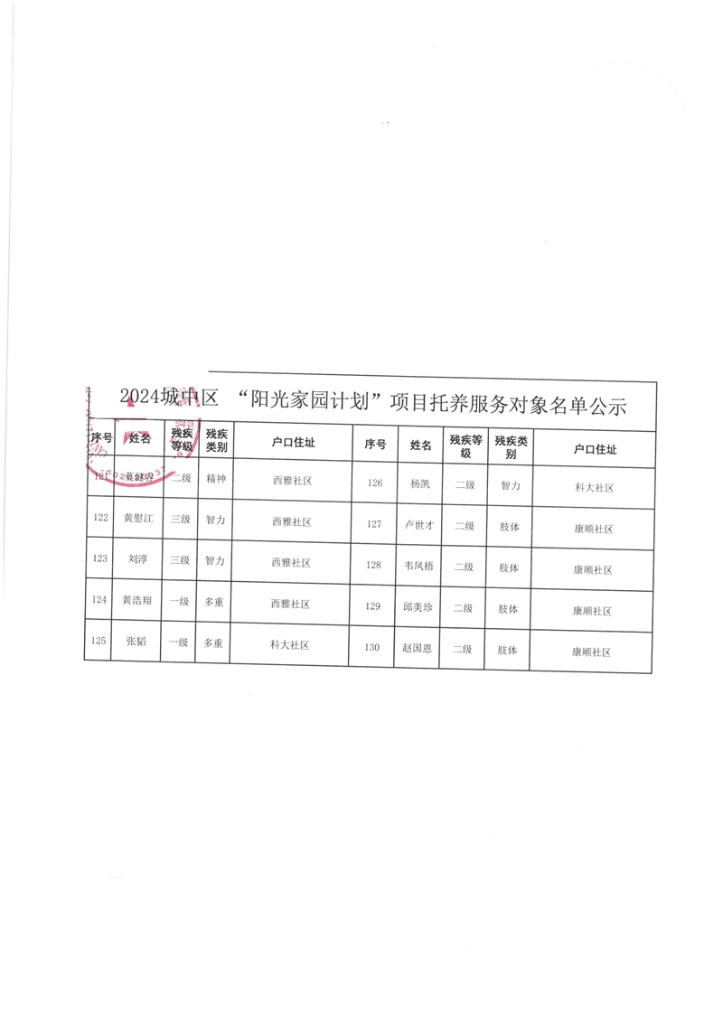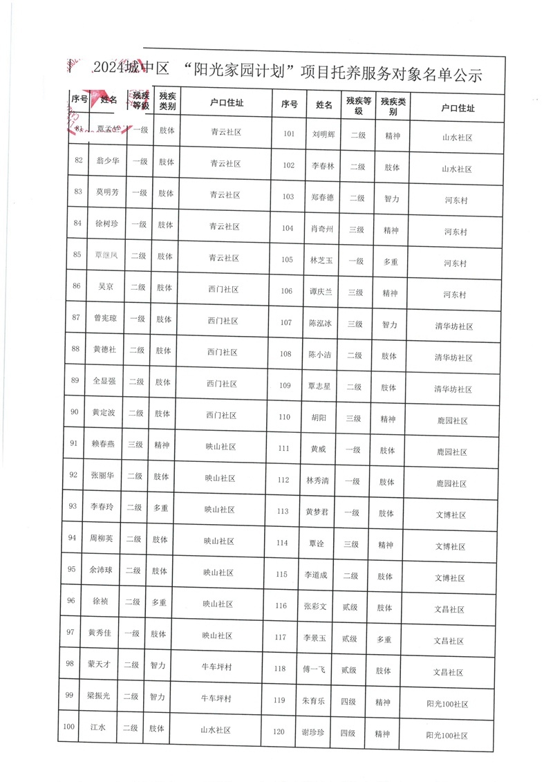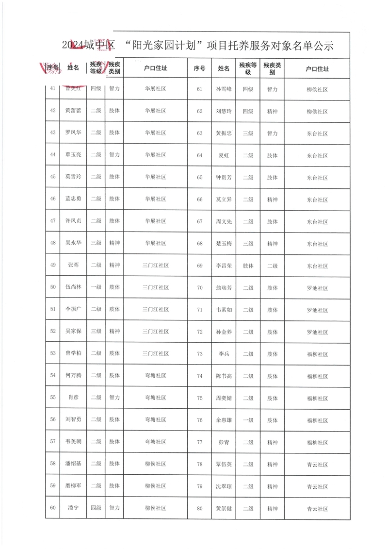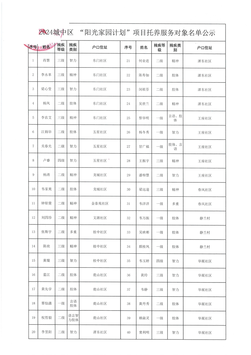 “阳光家园计划”项目是为16周岁以上智力、精神和重度肢体残疾人提供托养服务,根据个人申报,城中区残联审核,我区残疾人肖慧、李永革等130人拟纳入2024年度“阳光家园计划”项目托养服务对象,现将名单公示如下,公示时间为5个工作日,自2024年1月15日至2024年1月19日,如有疑义请于1月19日前来信来电反映,信件以邮戳时间为准。邮寄地址:柳州市城中区为民服务中心7楼713室,举报电话:0772-2823665