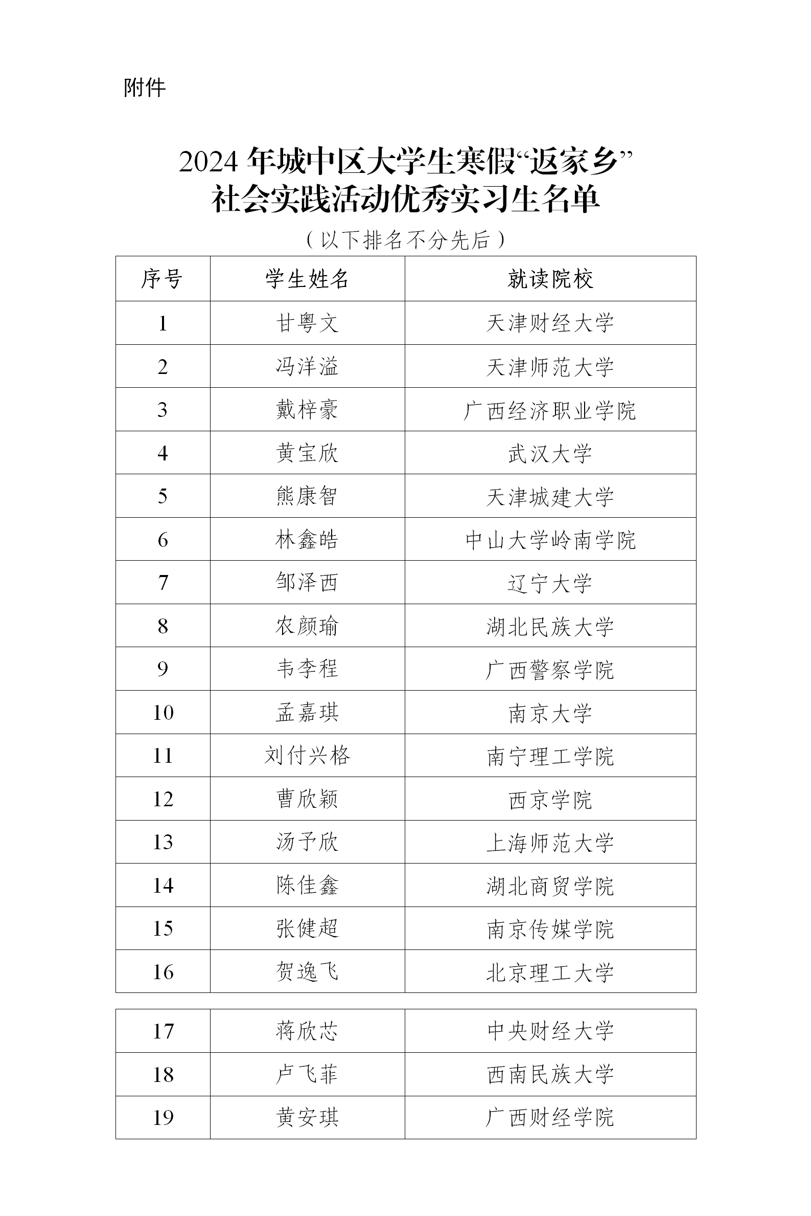 根据共青团柳州市城中区委员会《关于推荐2024年城中区大学生寒假“返家乡”社会实践活动优秀实习生的通知》要求,经推荐、审查,经研究,评定出甘粤文等19名同学为2024年柳州市城中区大学生寒假“返家乡”社会实践活动优秀实习生。