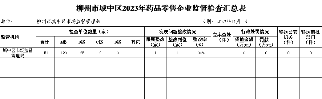 柳州市城中区2023年药品零售企业监督检查汇总表
