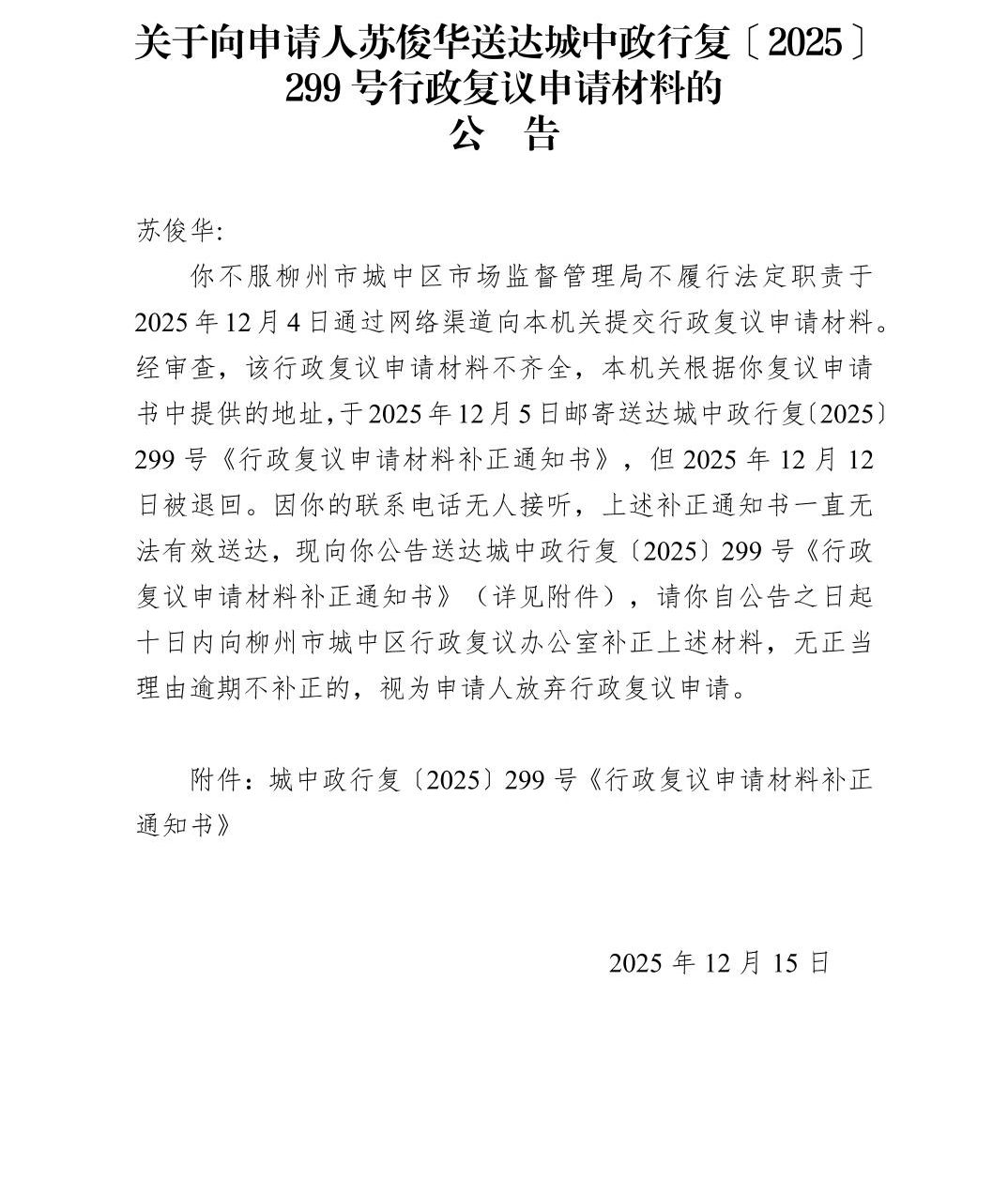 关于向申请人苏俊华送达城中政行复〔2025〕299号行政复议补正通知书的公告