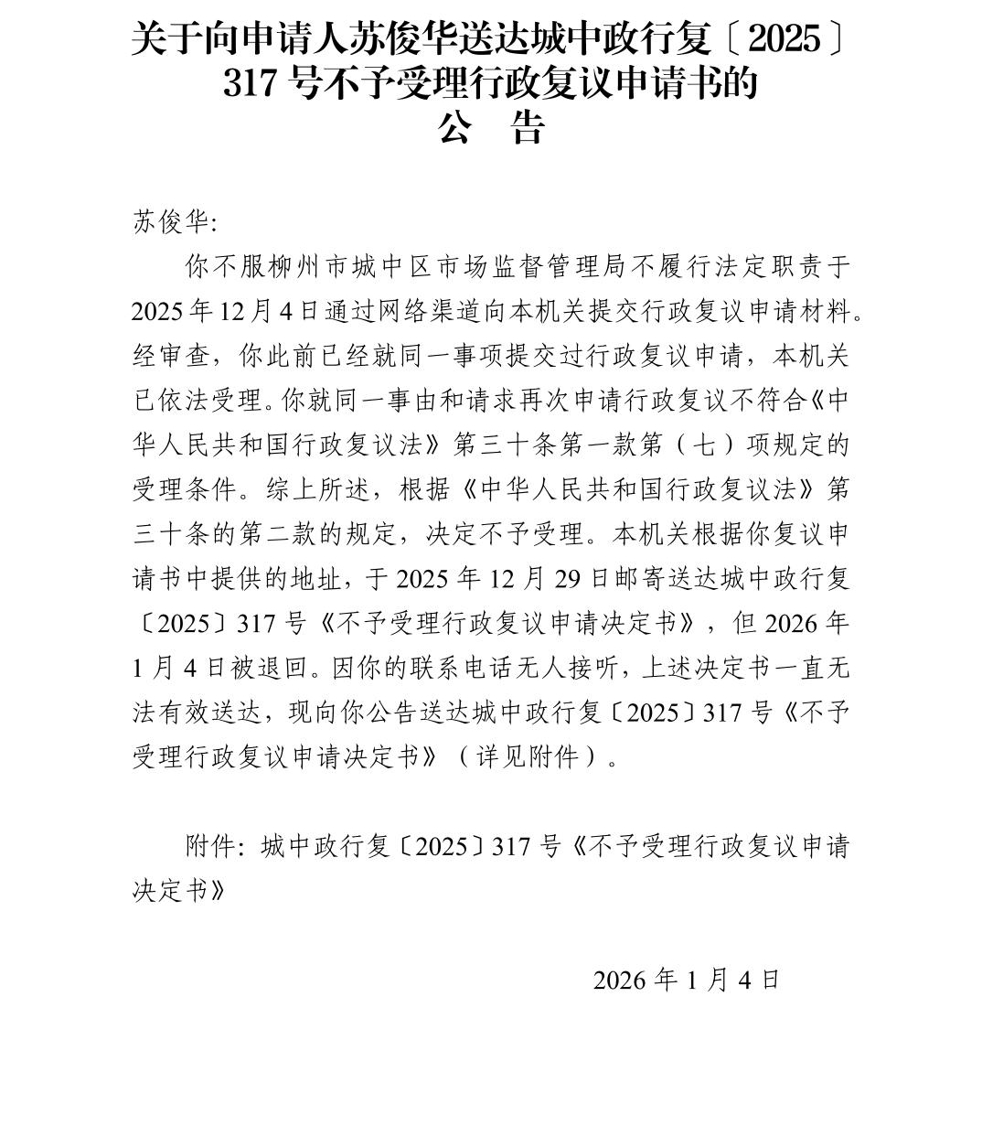 关于向申请人苏俊华送达城中政行复〔2025〕317号不予受理行政复议申请书的公告