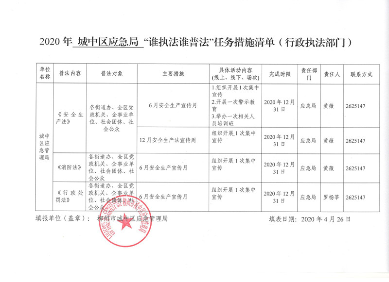 【城中区应急管理局】2020年城中区应急局“谁执法谁普法”任务措施清单