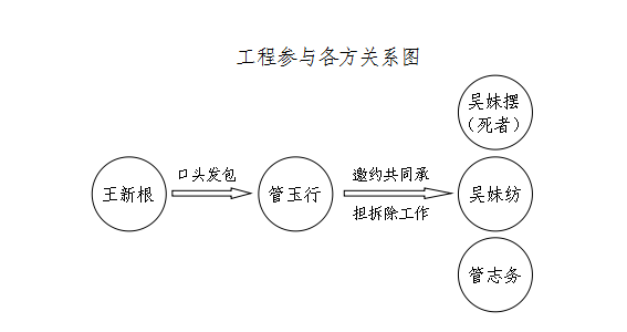 2.伤死者身份:本次事故中的伤者管玉行(融水县人,男,52岁)是承包工程者;死者吴妹摆(融水县人,女,40岁)是受管玉行邀约共同承担拆除工作的工人之一。
