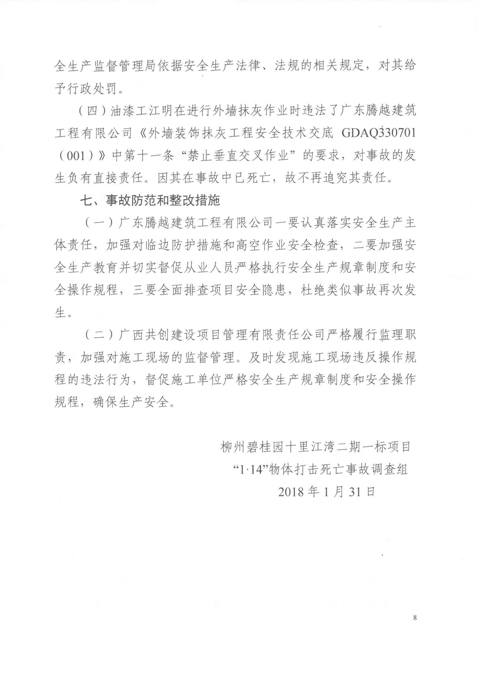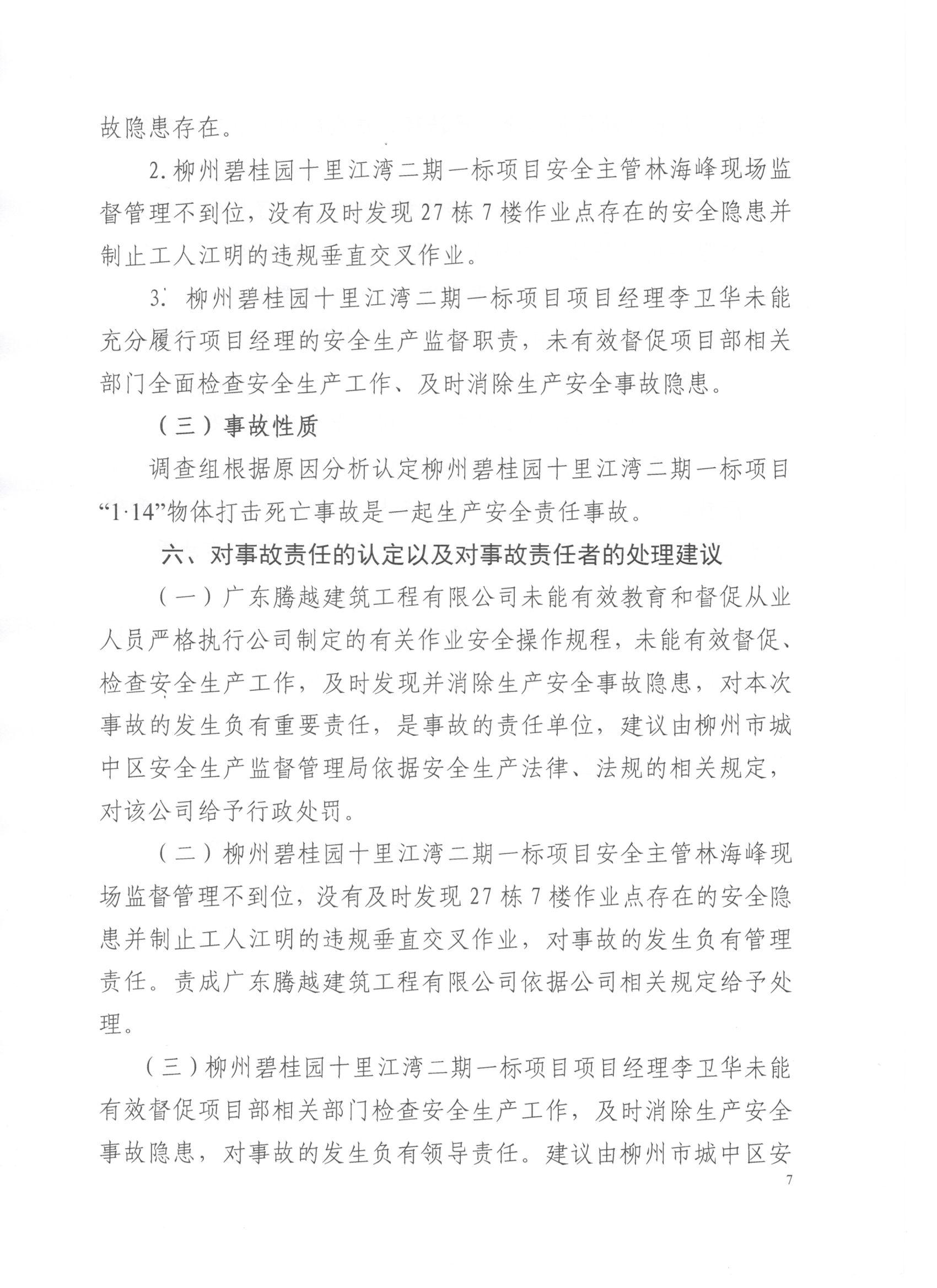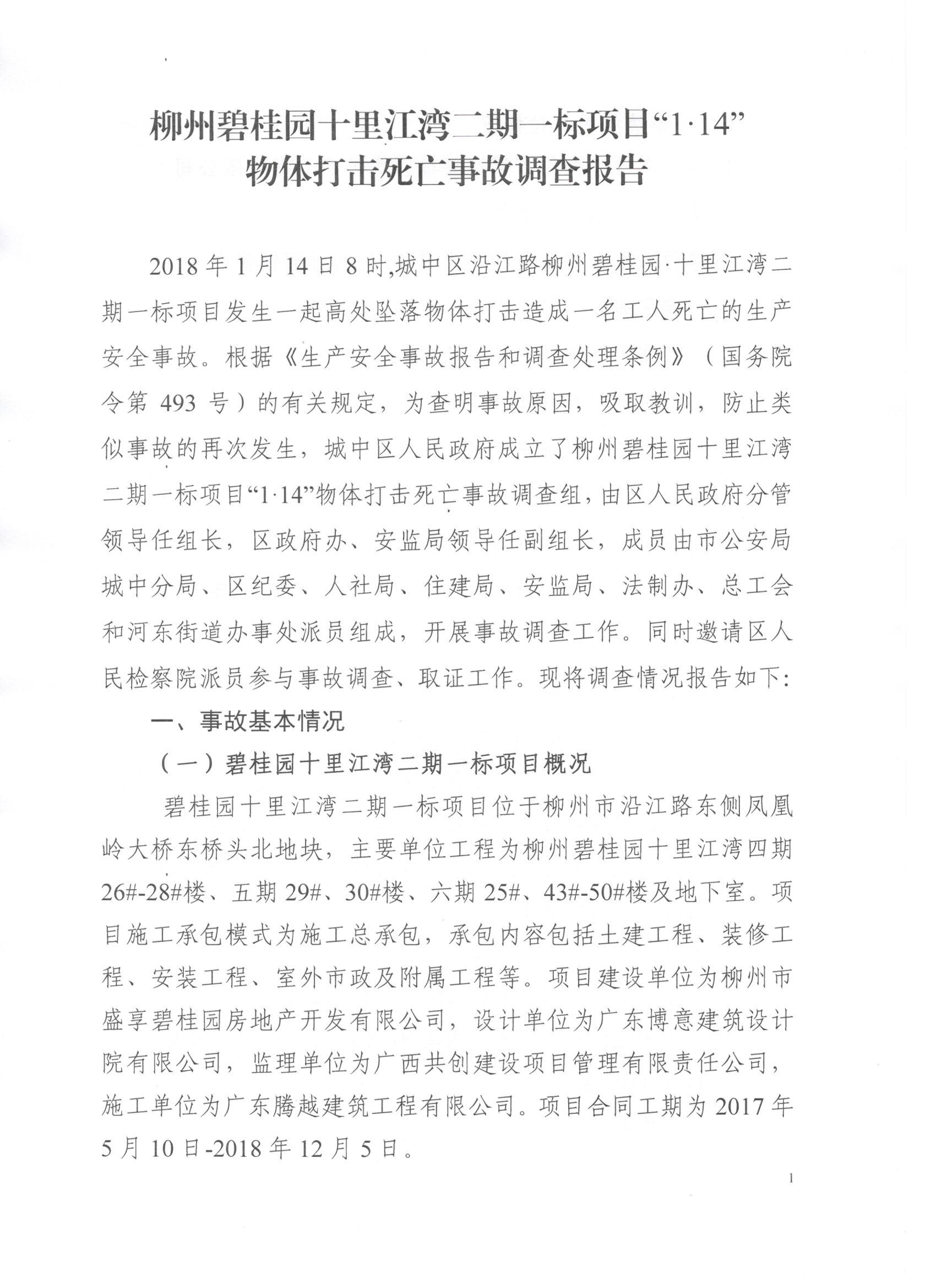 柳州碧桂园十里江湾二期一标项目“1.14”物体打击死亡事故调查报告详见附件