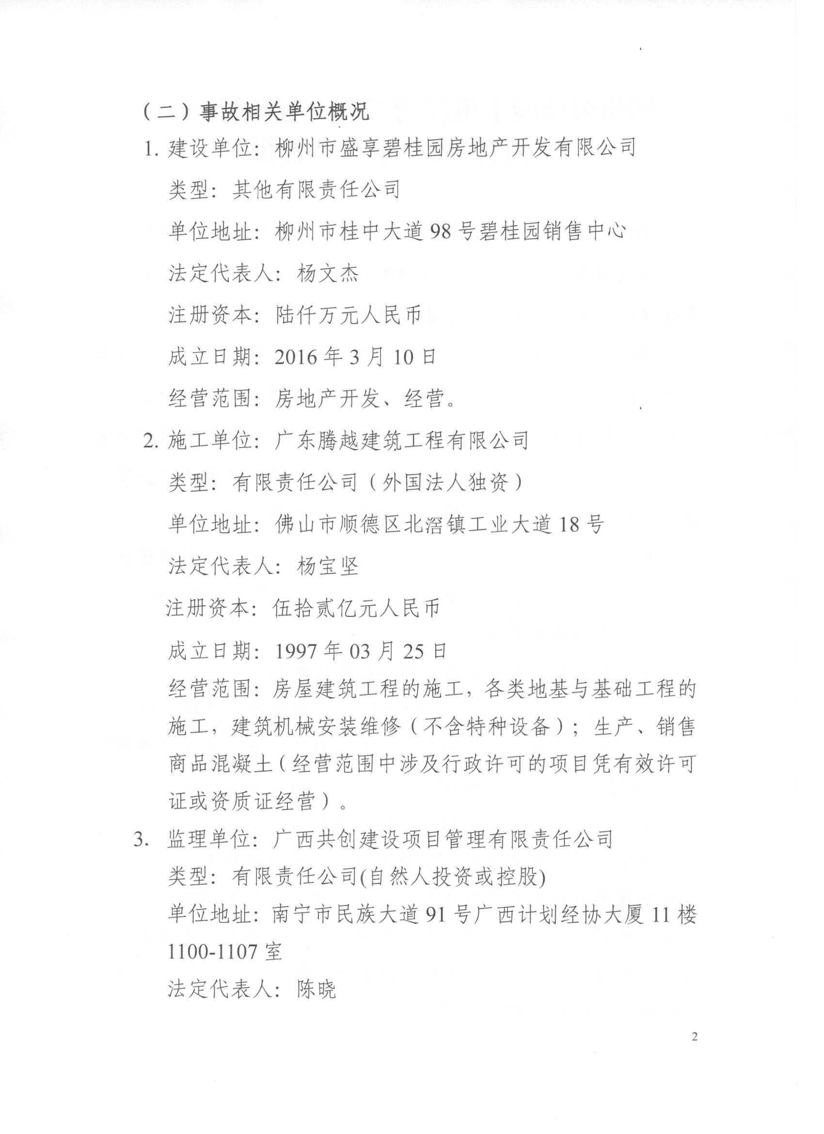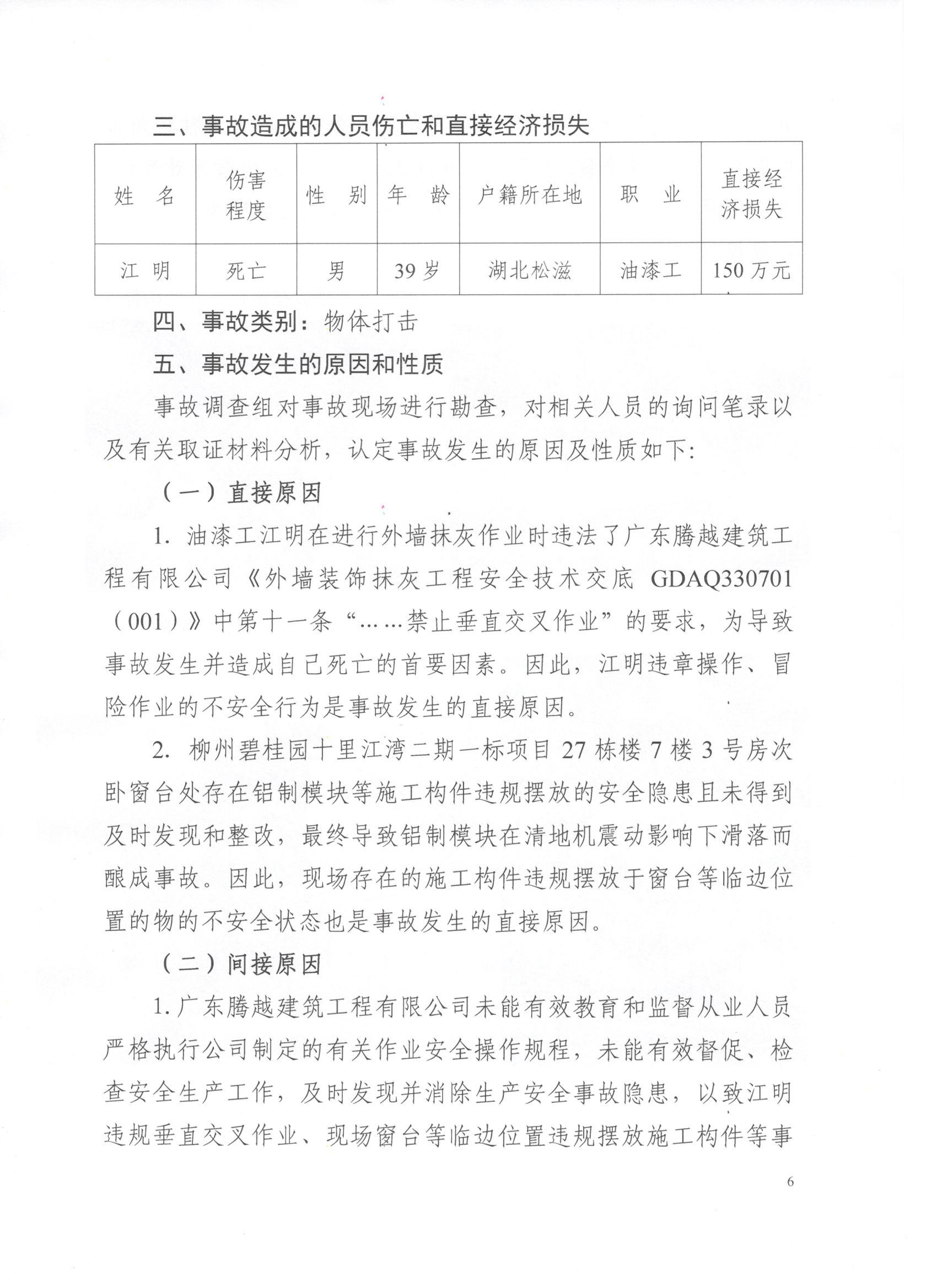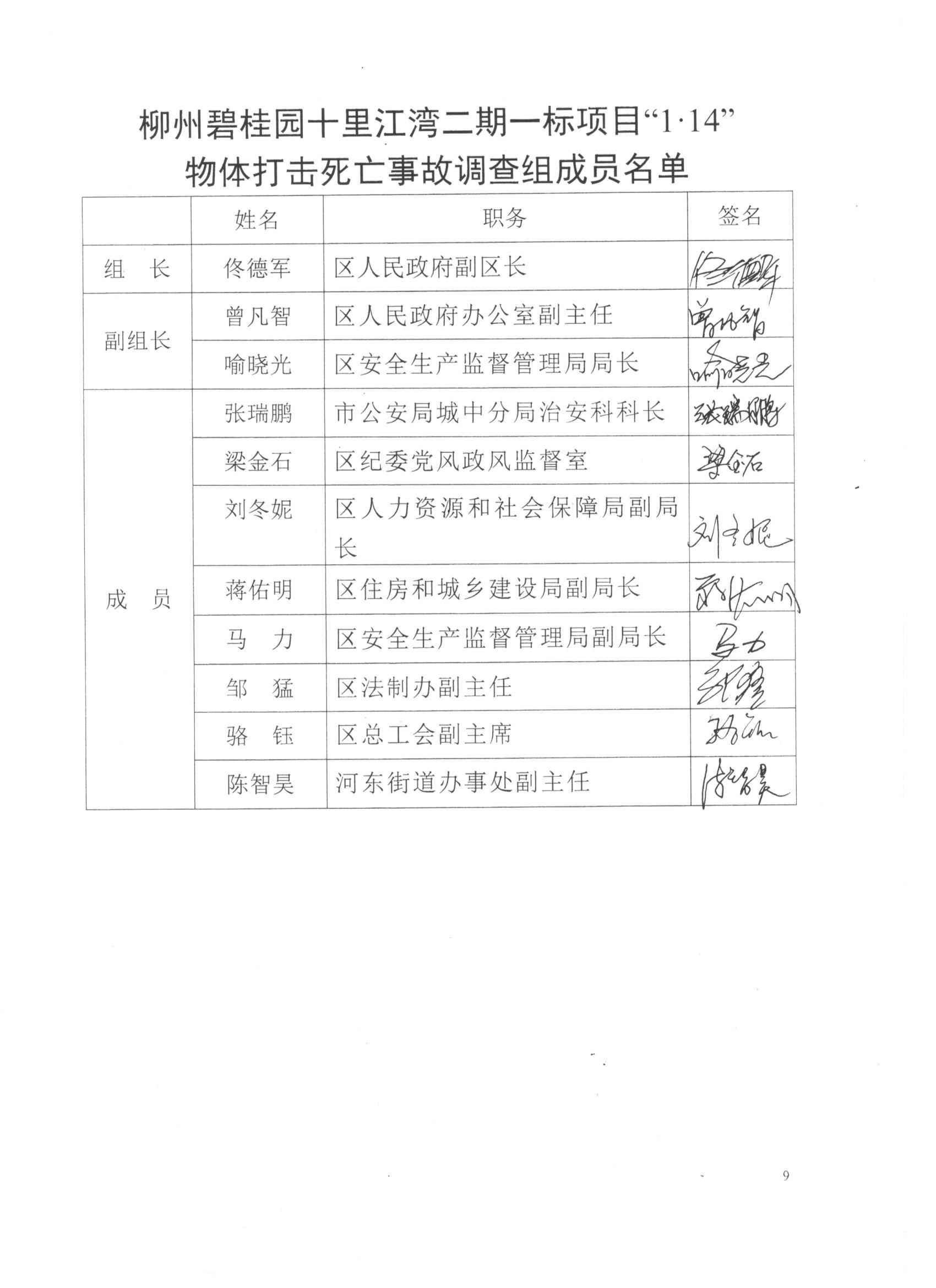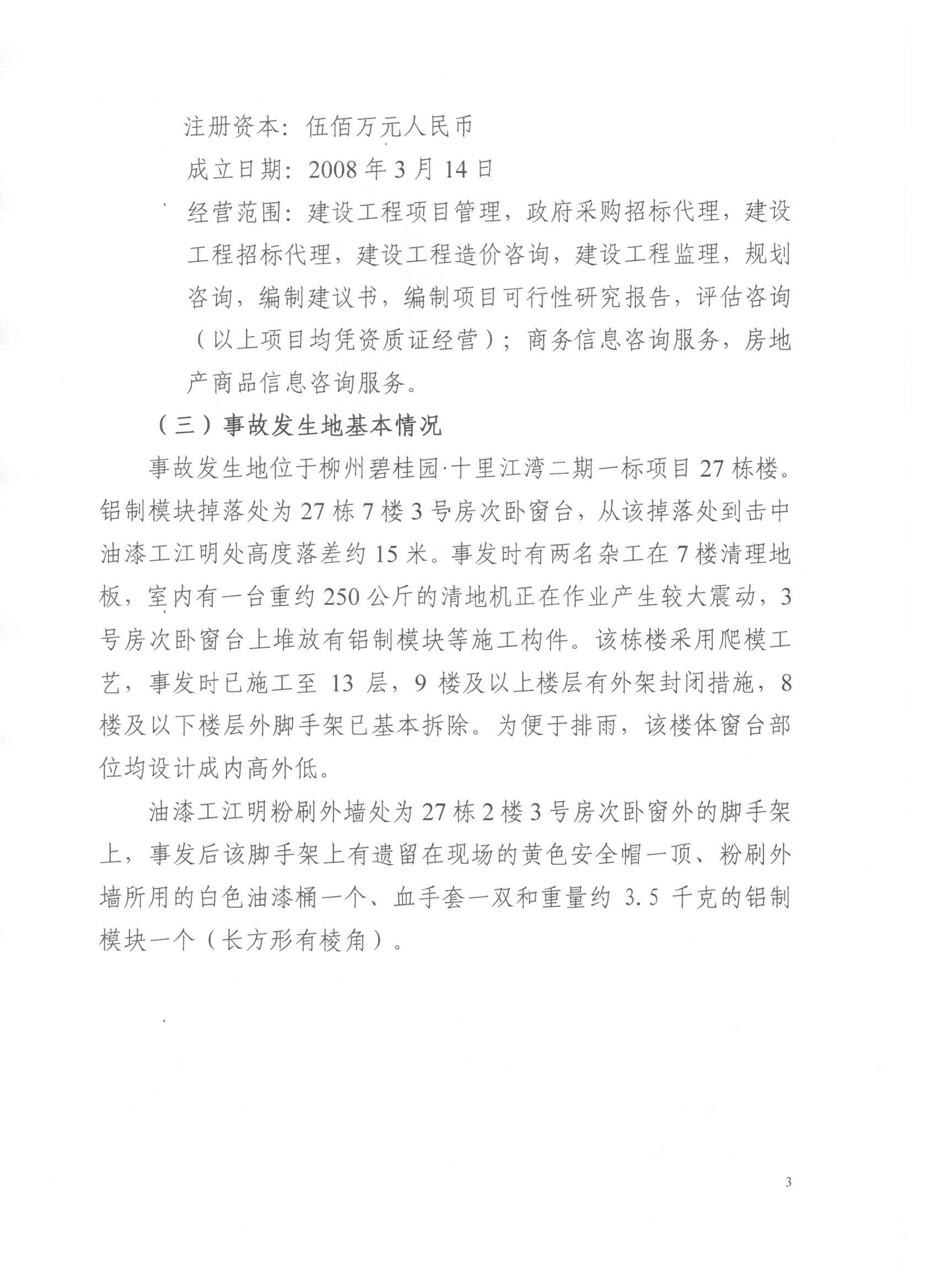 柳州碧桂园十里江湾二期一标项目“1.14”物体打击死亡事故调查报告详见附件