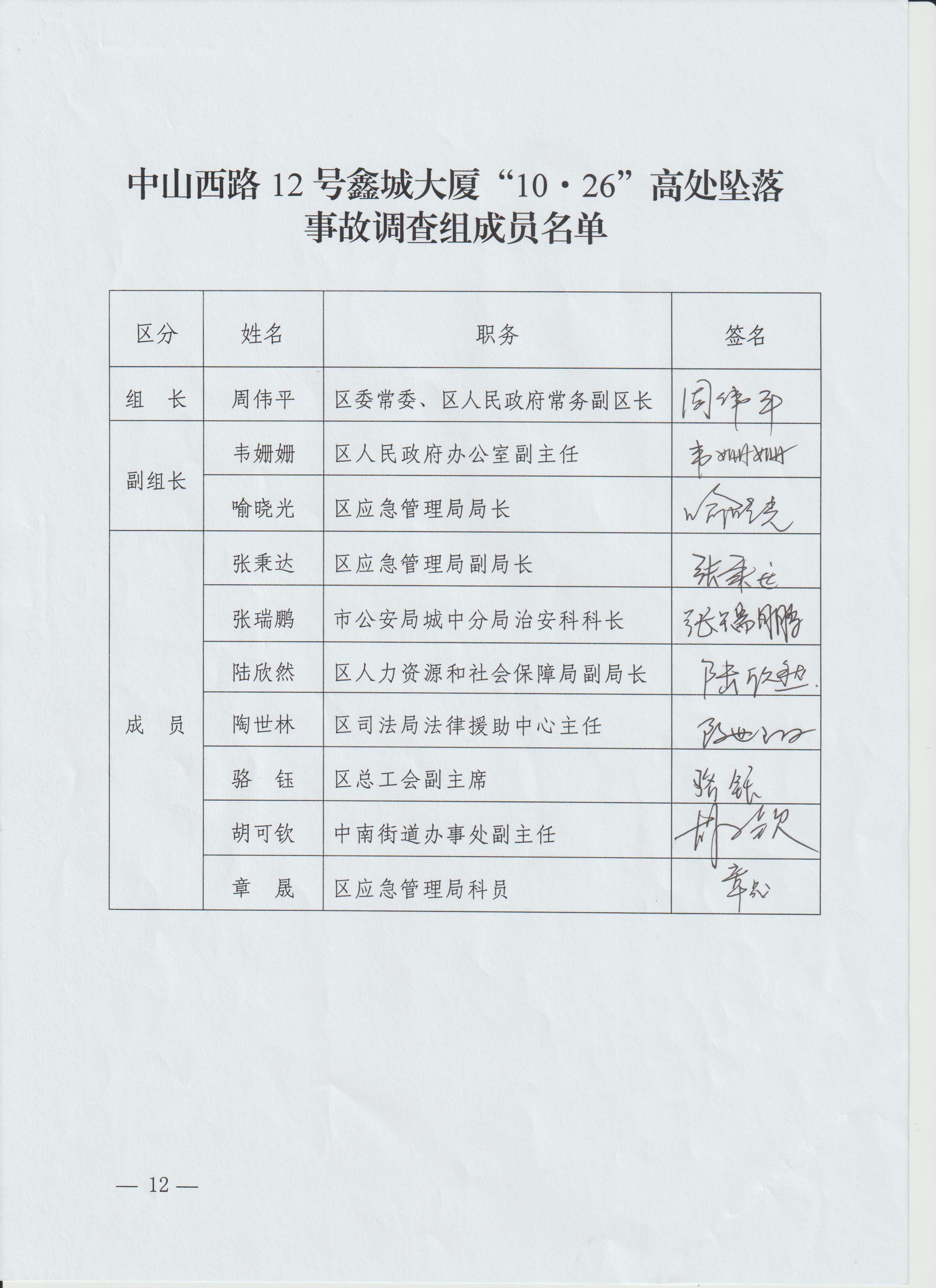 中山西路12号鑫城大厦“10·26”高处坠落事故调查组