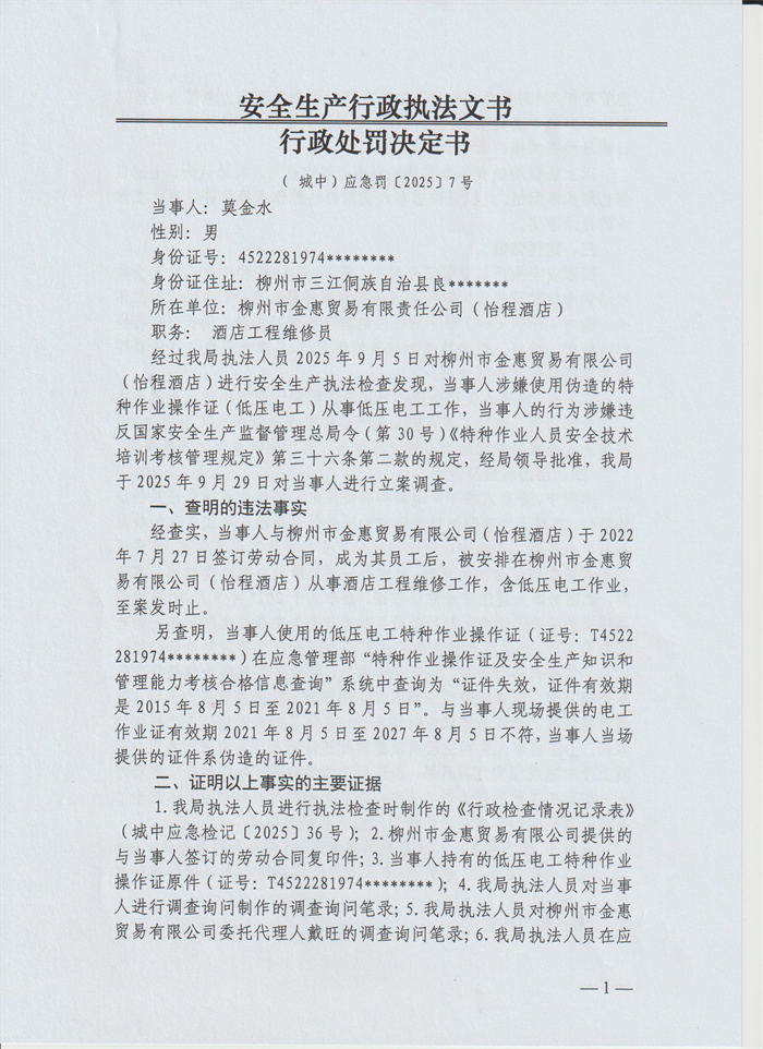 【城中区应急管理局】安全生产行政执法文书行政处罚决定书(城中)应急罚〔2025〕7号