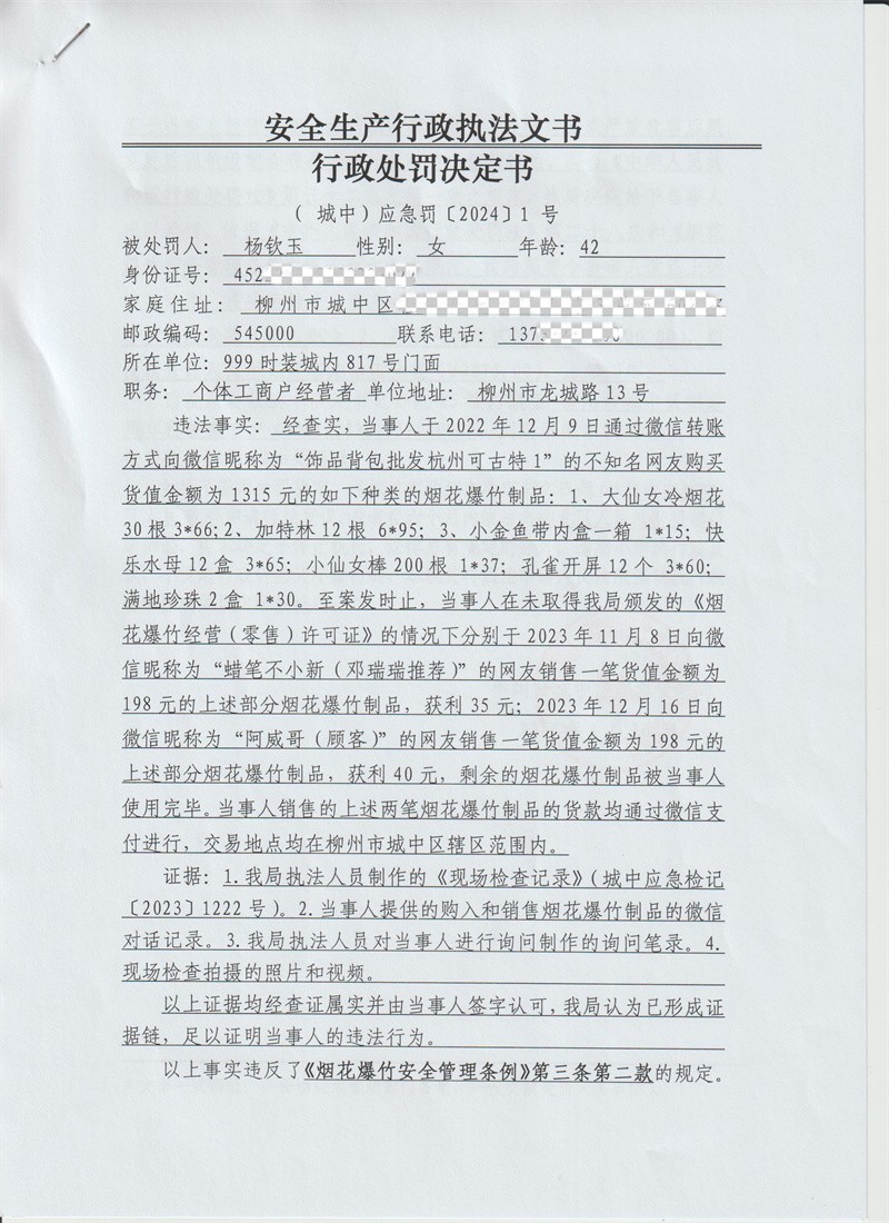 【城中区应急管理局】安全生产行政执法文书行政处罚决定书(个人)(城中)应急罚〔2024〕1号