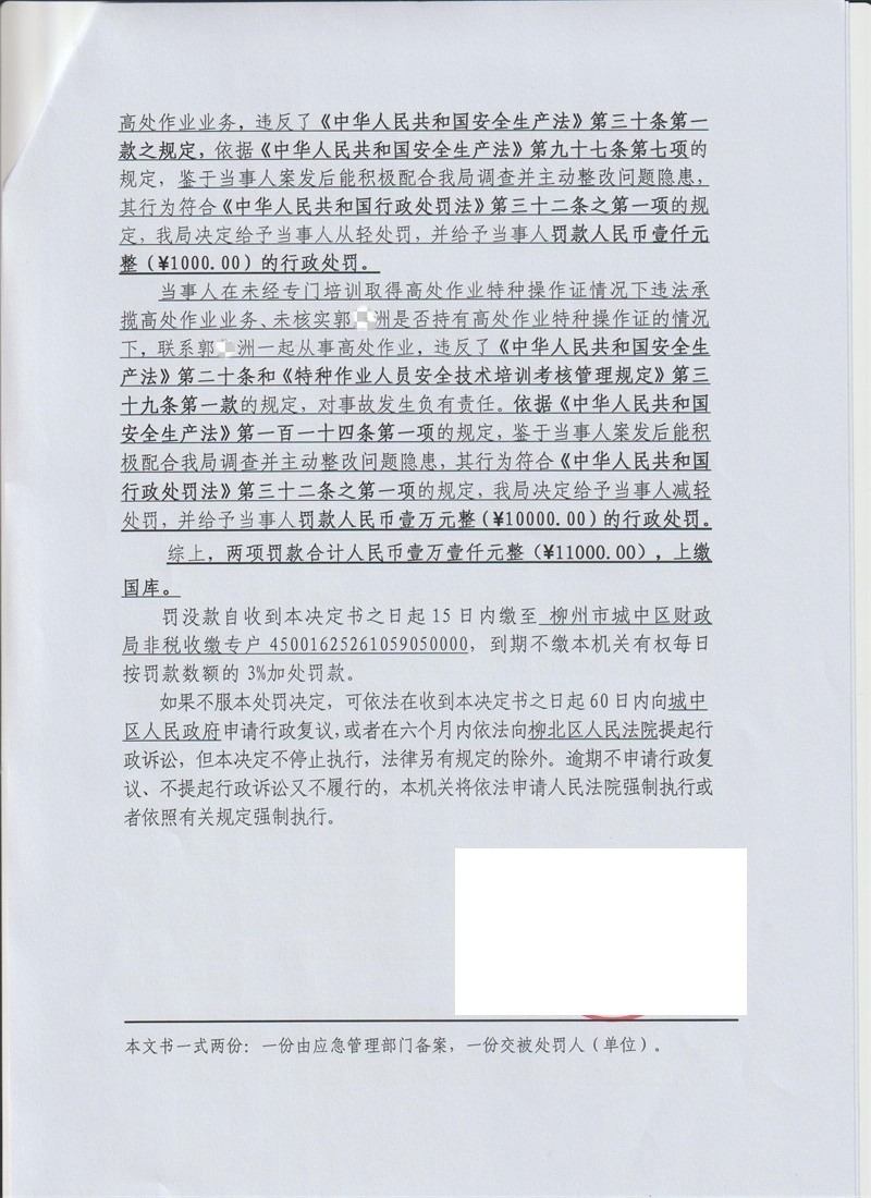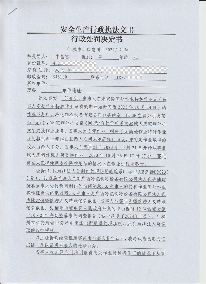 【城中区应急管理局】安全生产行政执法文书行政处罚决定书(个人)(城中)应急罚〔2024〕2号