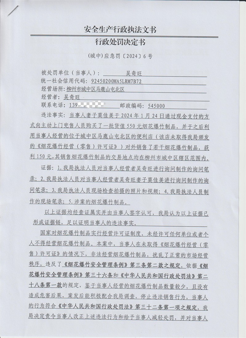 【城中区应急管理局】安全生产行政执法文书行政处罚决定书(个人)(城中)应急罚〔2024〕6号