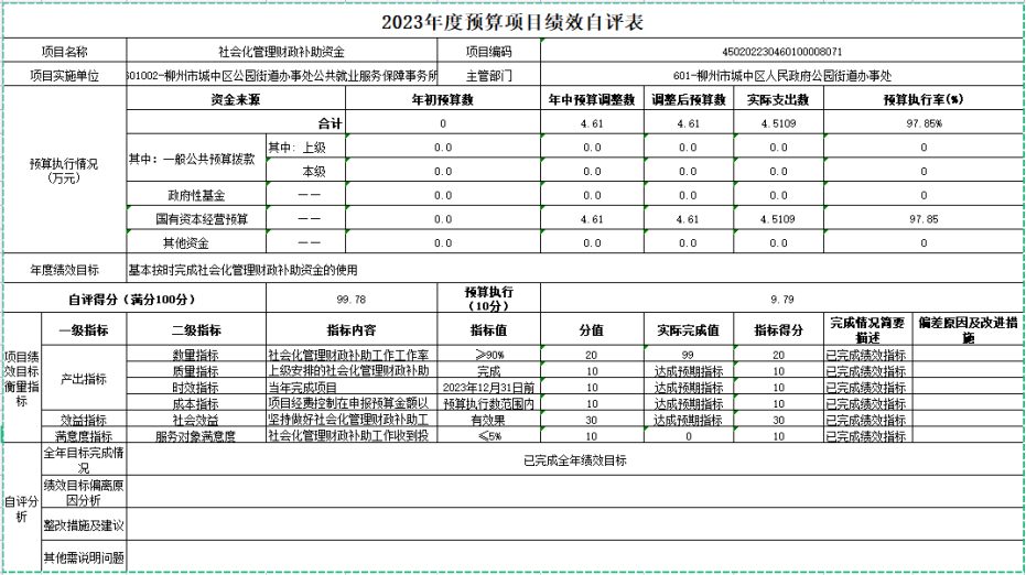 社会化管理财政补助资金项目自评综述:全年预算数4.61万元,执行数4.51万元,执行率为97.83%,自评得分为99.78分。项目绩效目标总体完成情况良好,完成预期设定的绩效目标。发现的主要问题:绩效分析较为简单。下一步改进措施:合理分解细化绩效目标,规范自评报告撰写格式,深入分析各项指标完成情况及问题产生原因。