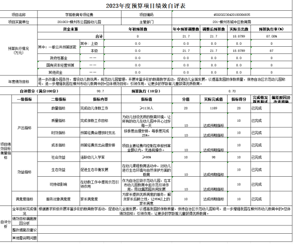 本单位组织对“学前教育专项经费”项目进行了部门评价,涉及一般公共预算支出21.70万元,政府性基金预算支出0万元。其中对“学前教育专项经费”开展项目绩效评价。《2023年度项目支出绩效自评表》详见最后页。