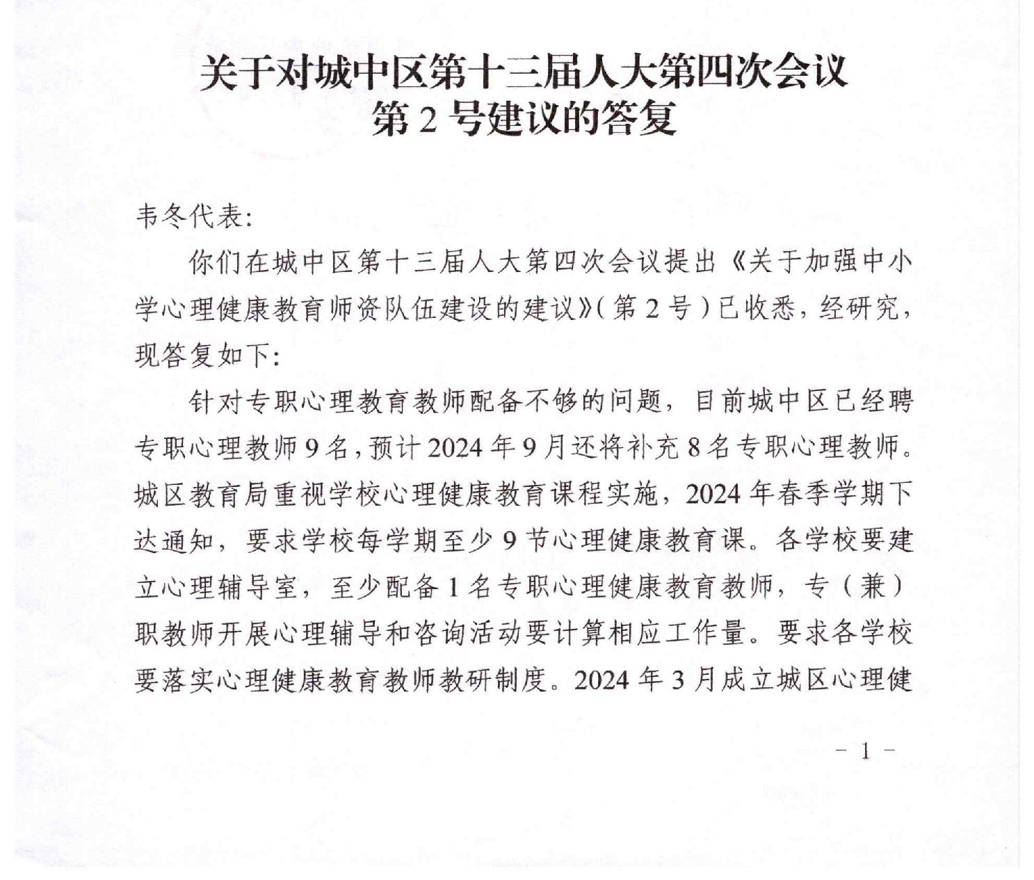 关于对城中区第十三届人大第四次会议第2号建议的答复