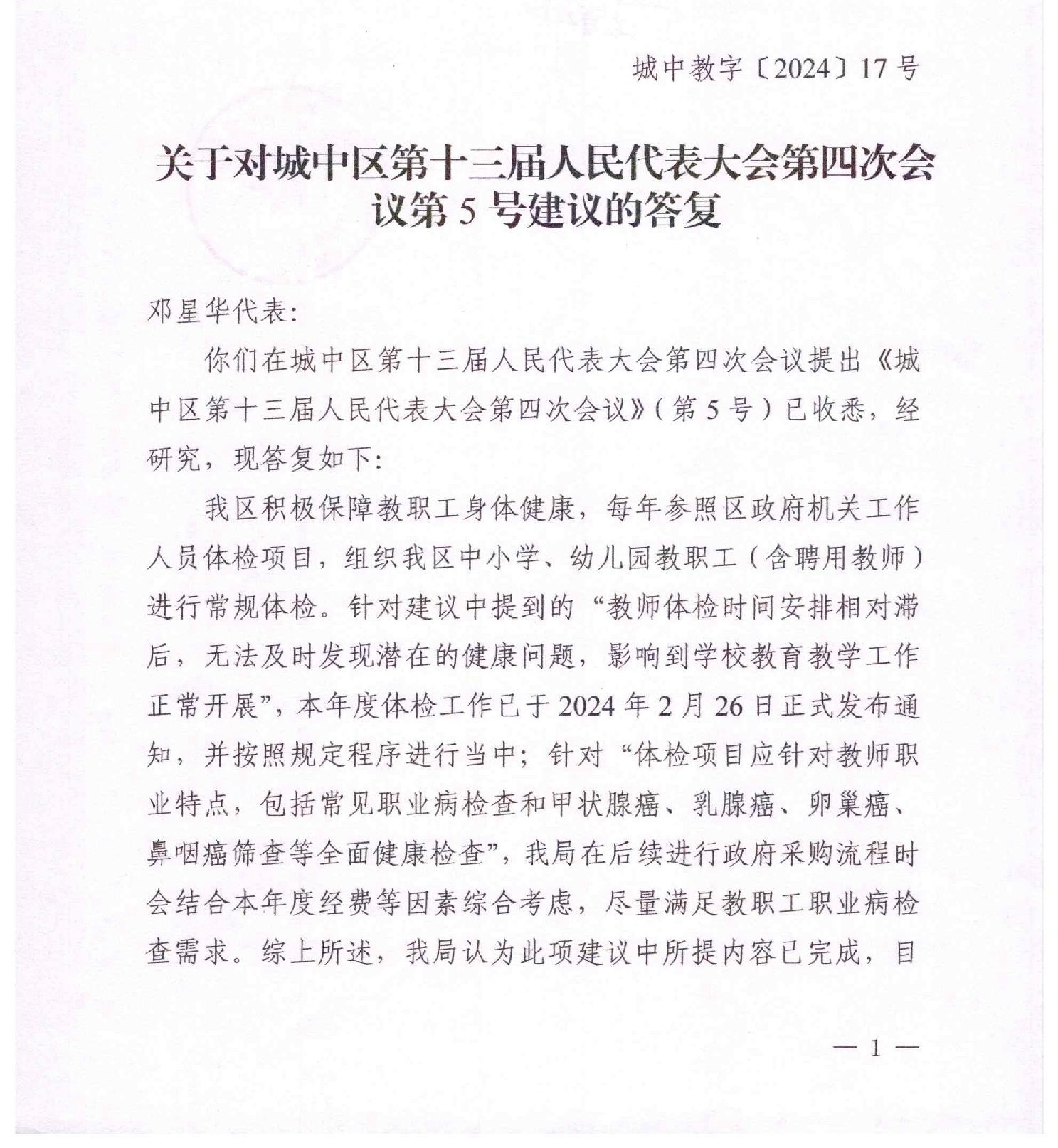 关于对城中区第十三届人大第四次会议第5号建议的答复