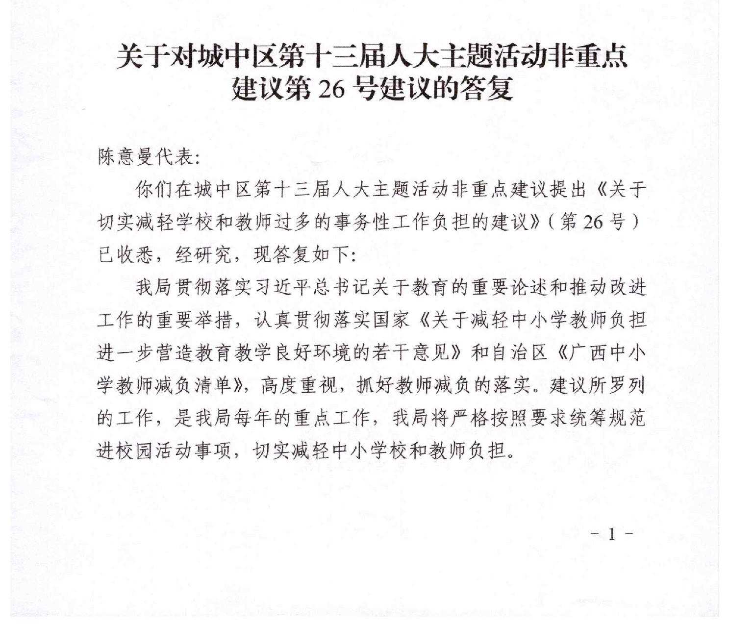 关于对城中区第十三届人大主题活动非重点建议第26号建议的答复
