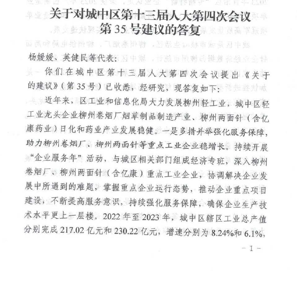 关于对城中区第十三届人大第四次会议第35号建议的答复