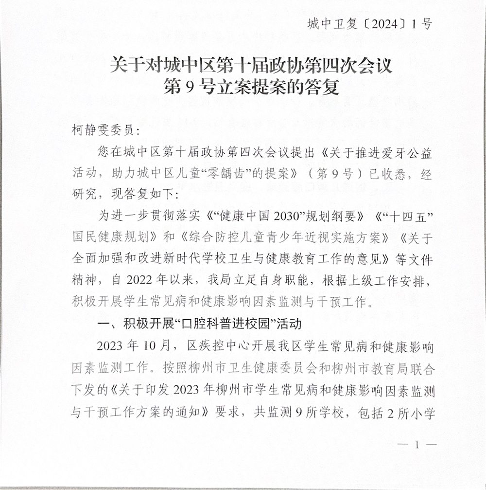 关于对城中区第十届政协第四次会议第9号立案提案的答复