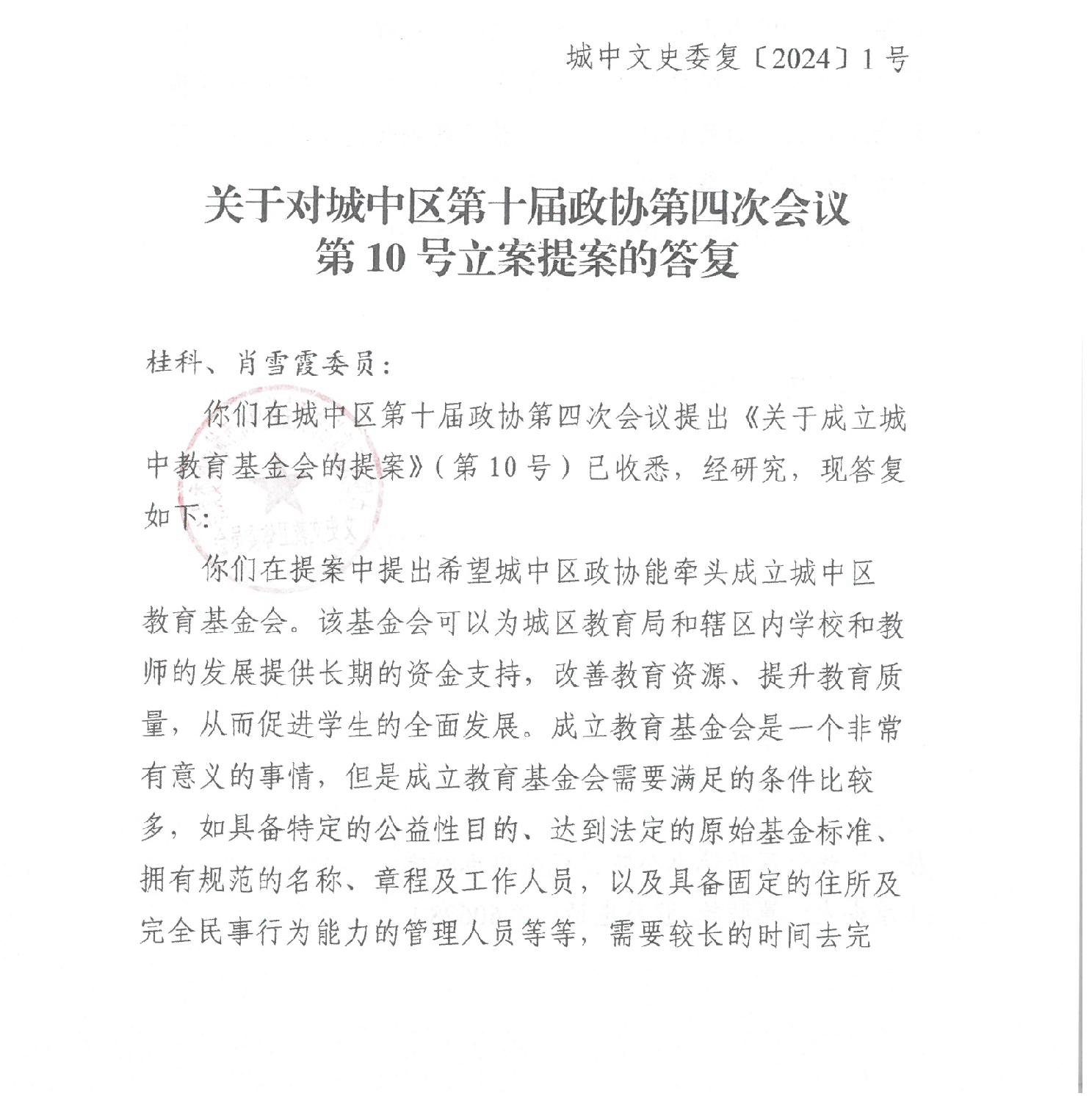 关于对城中区第十届政协第四次会议第10号立案提案的答复