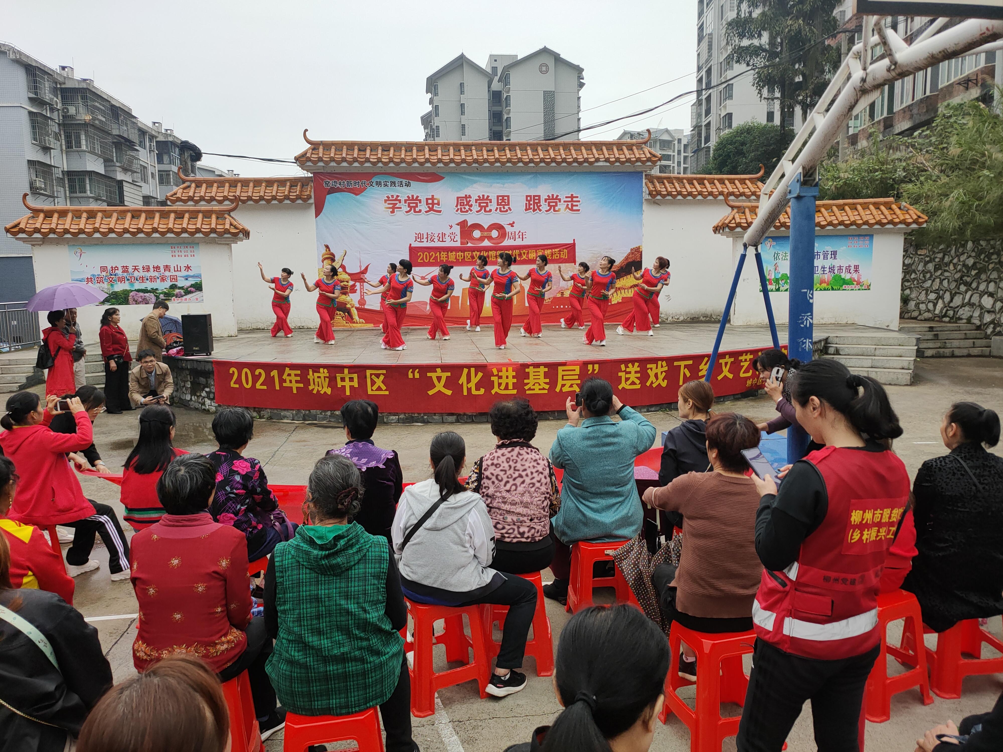 上午9:30分,热情高涨的乡亲们冒着蒙蒙细雨赶到窑埠村文化广场,演出现场,铿锵的锣鼓、传统的唱腔,城中区红舞鞋艺术团的演员们惟妙惟肖的投入表演让观众大呼过瘾。演出的节目丰富多彩,形式多样,有歌舞《和谐大家园》、《我的祖国》、女声独唱《我属于你中国》、渔鼓《昂首阔步跟党走》等节目,广场上充满了欢声笑语,村民们正在兴高采烈地观看戏曲、情景舞蹈、歌曲等节目。
