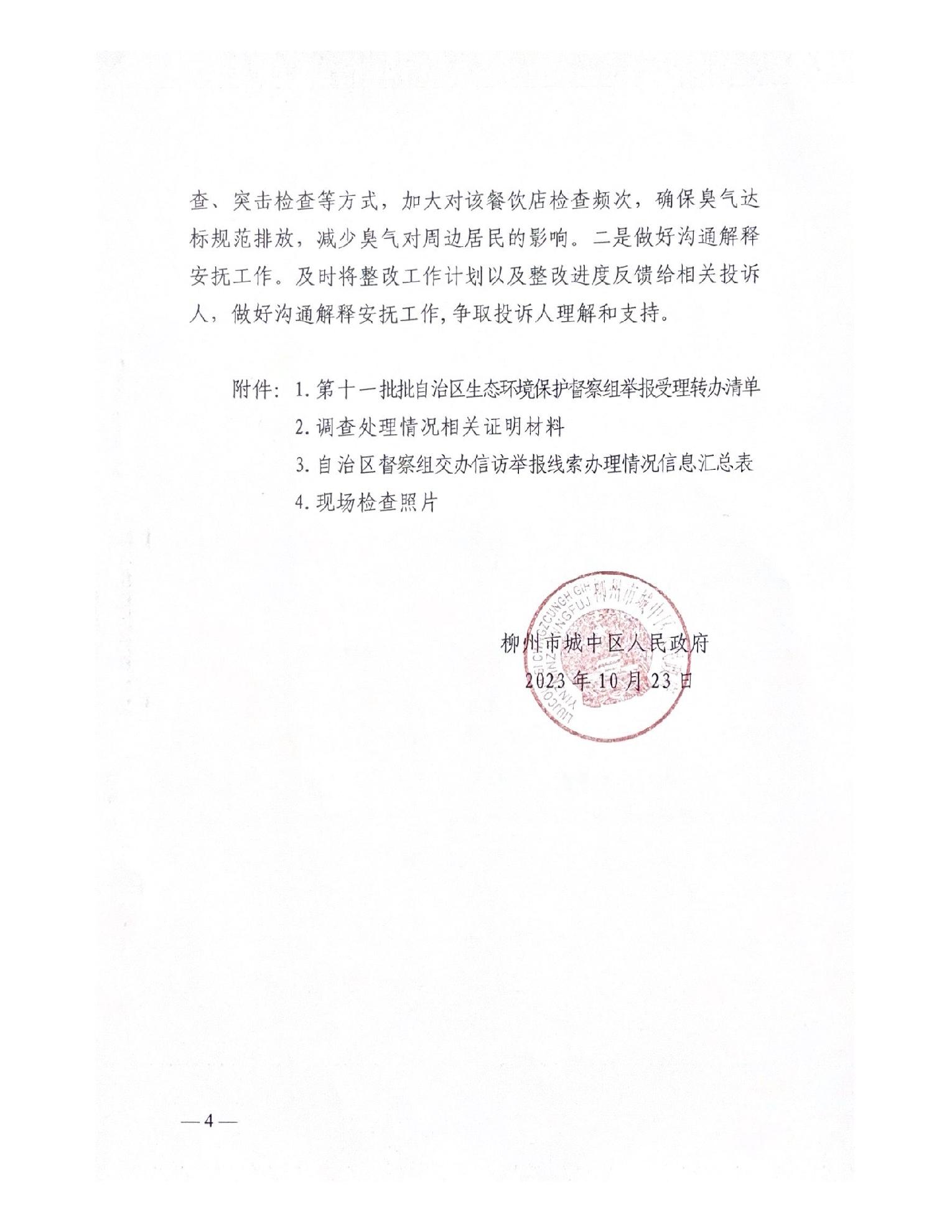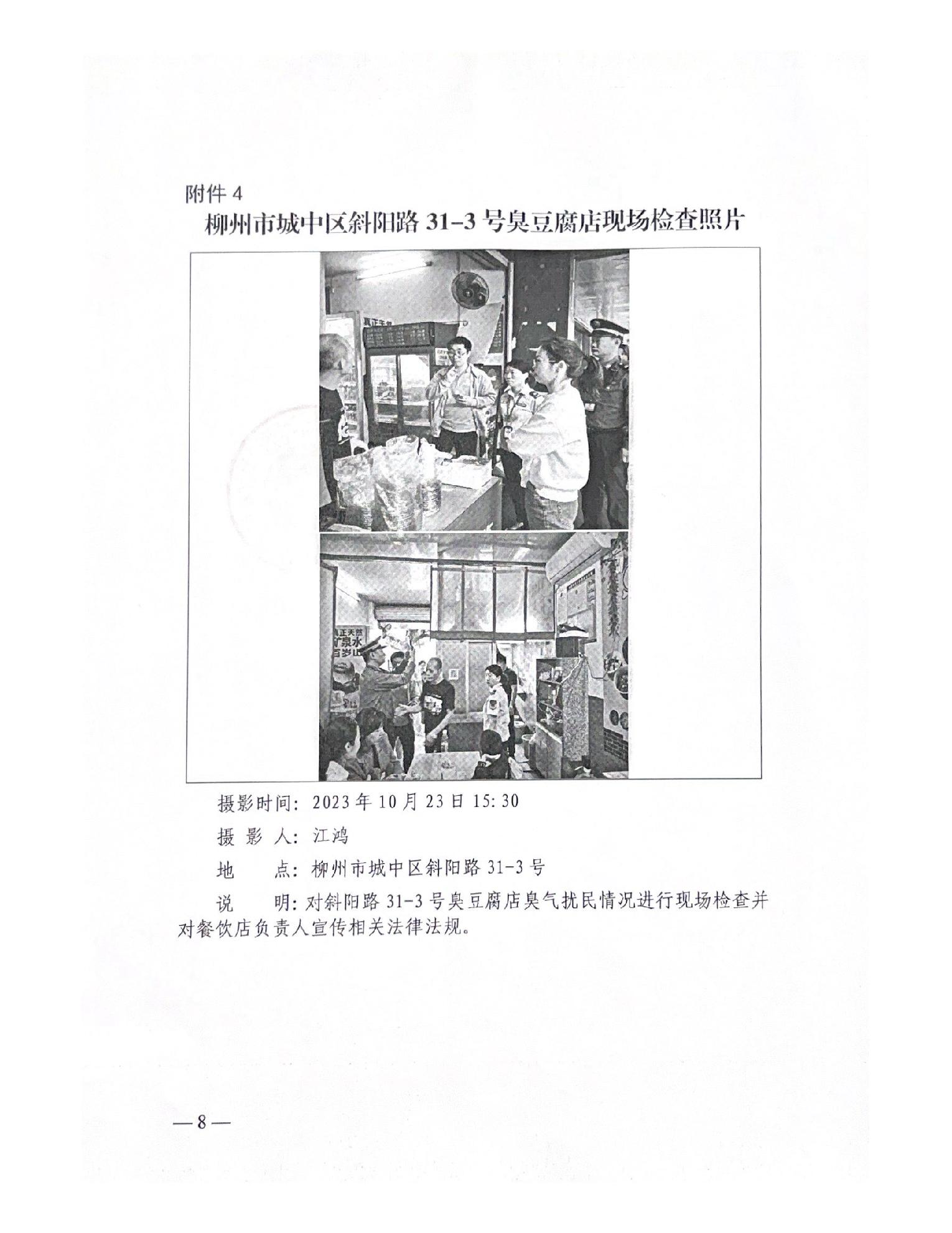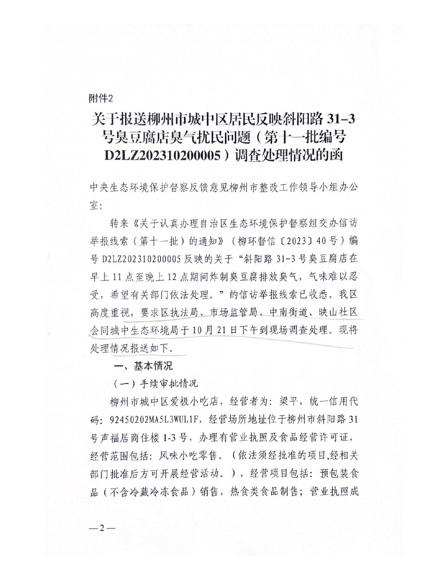 关于报送柳州市城中区居民反映斜阳路31-3号臭豆腐店臭气问题(第十一批编号D2LZ202310200005)调查处理情况的函