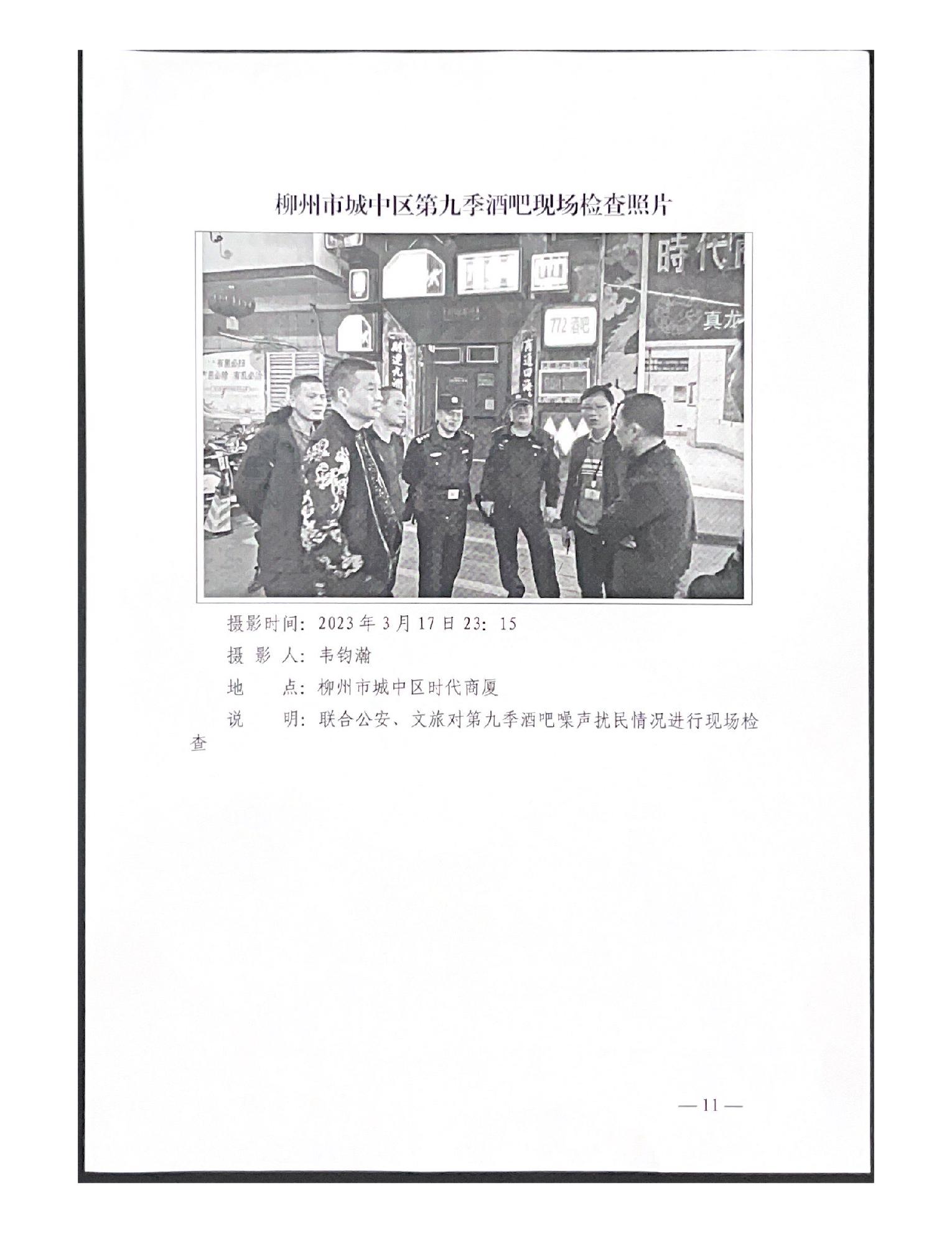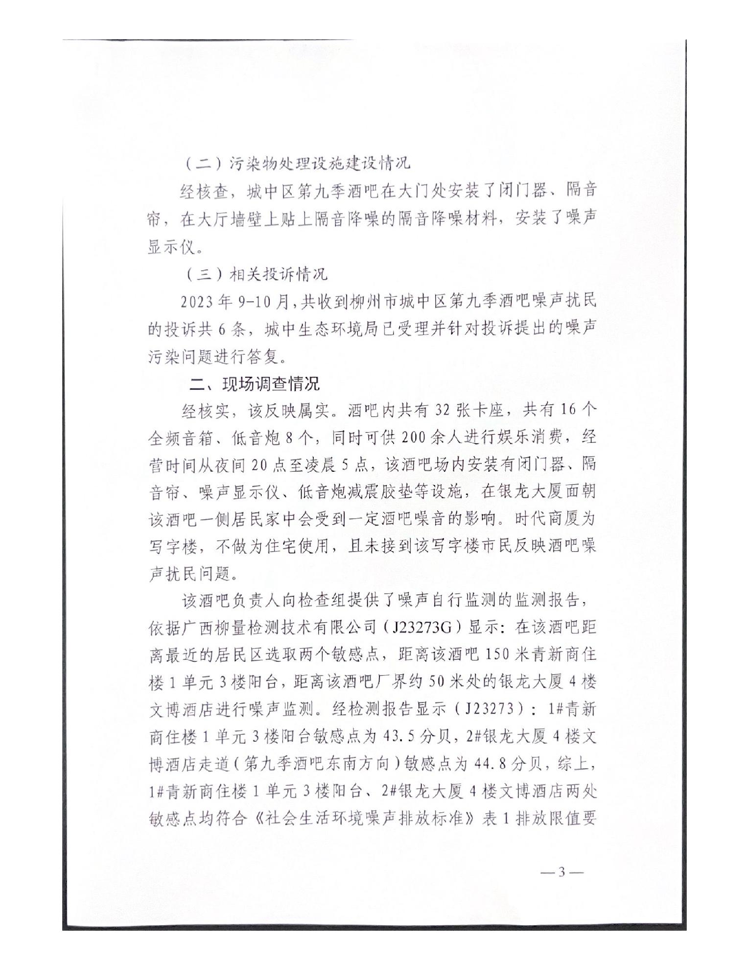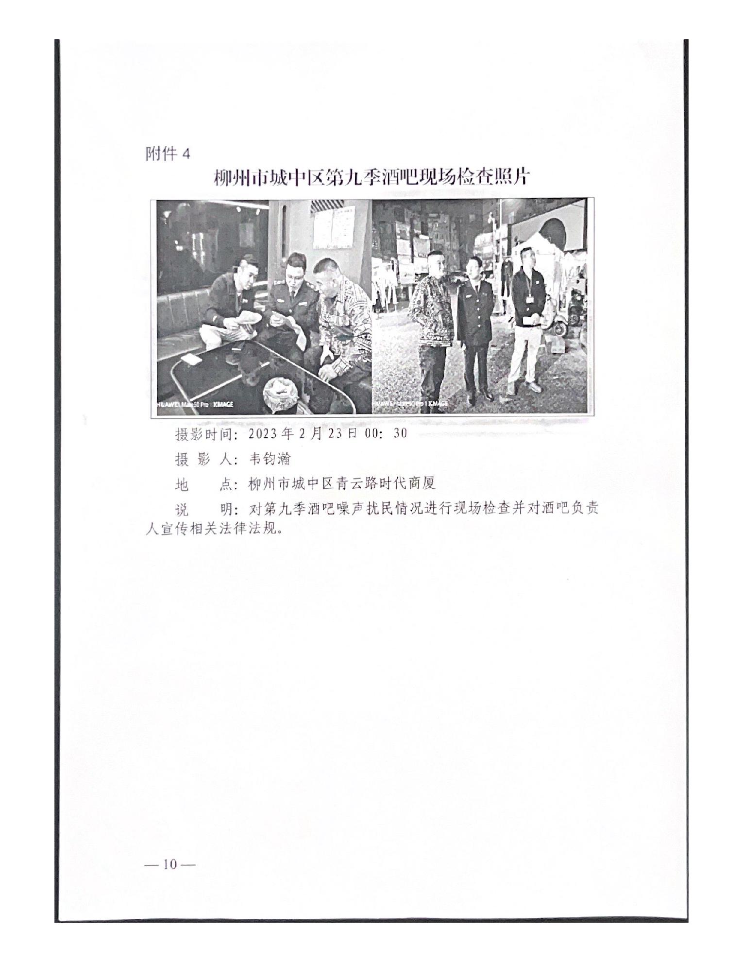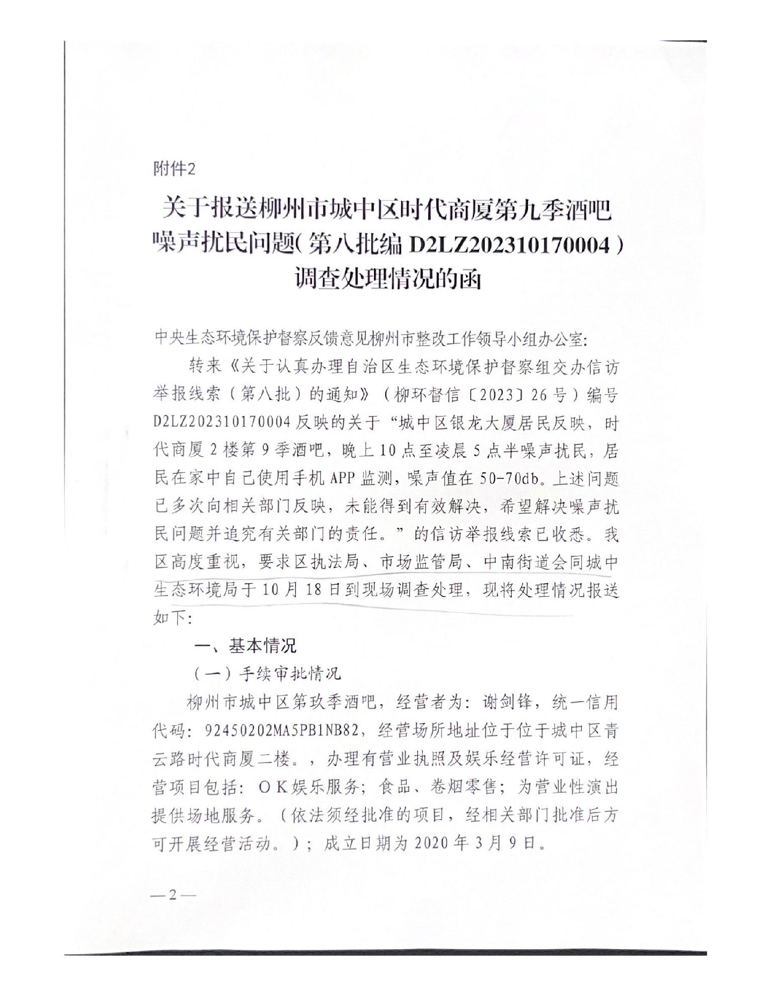 关于报送柳州市城中区时代商厦第九季酒吧噪声扰民问题(第八批编号D2LZ202310170004)调查处理情况的函