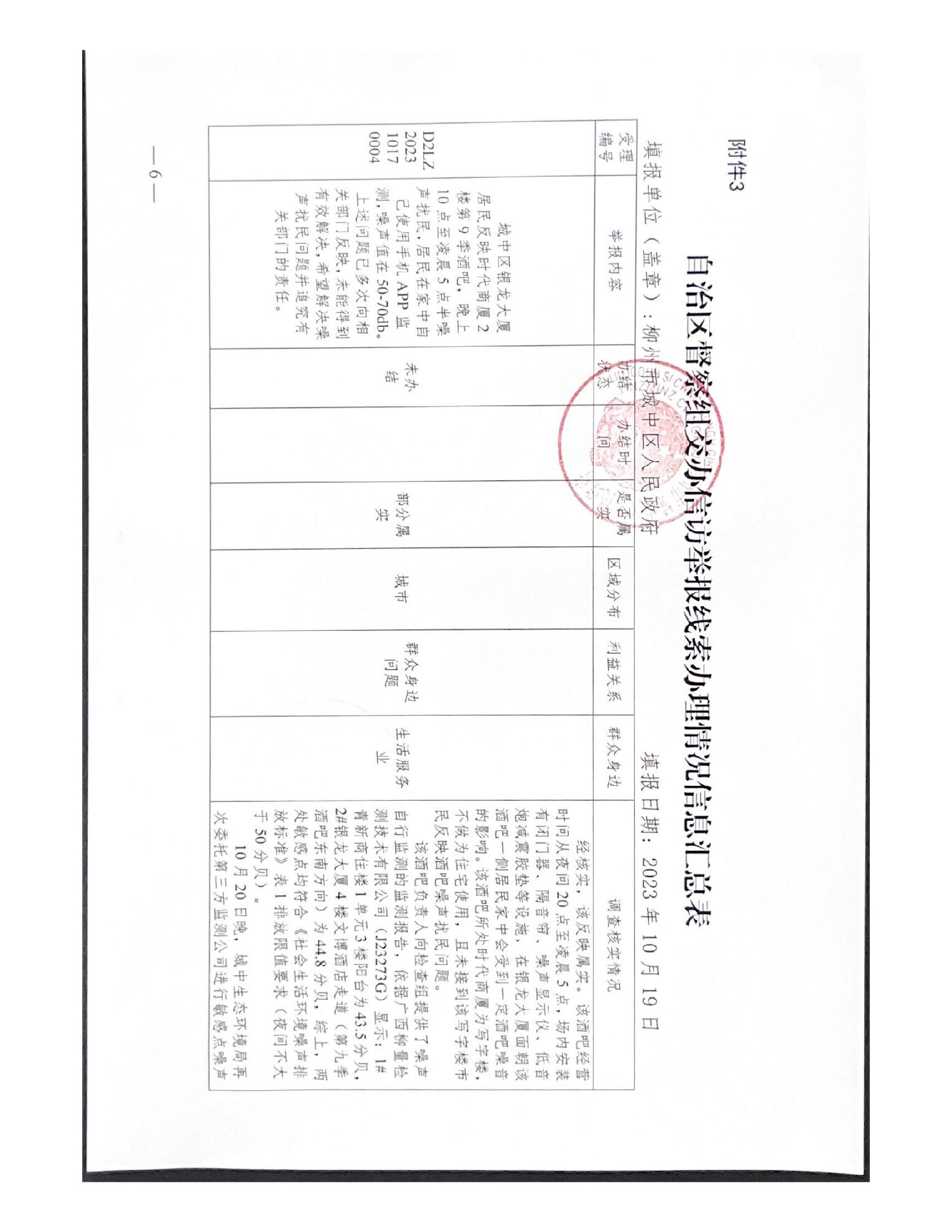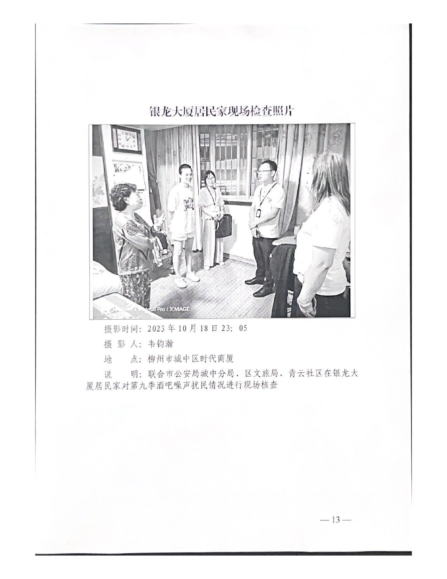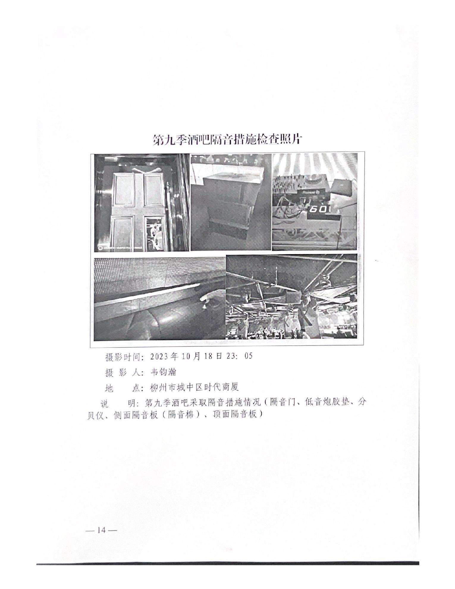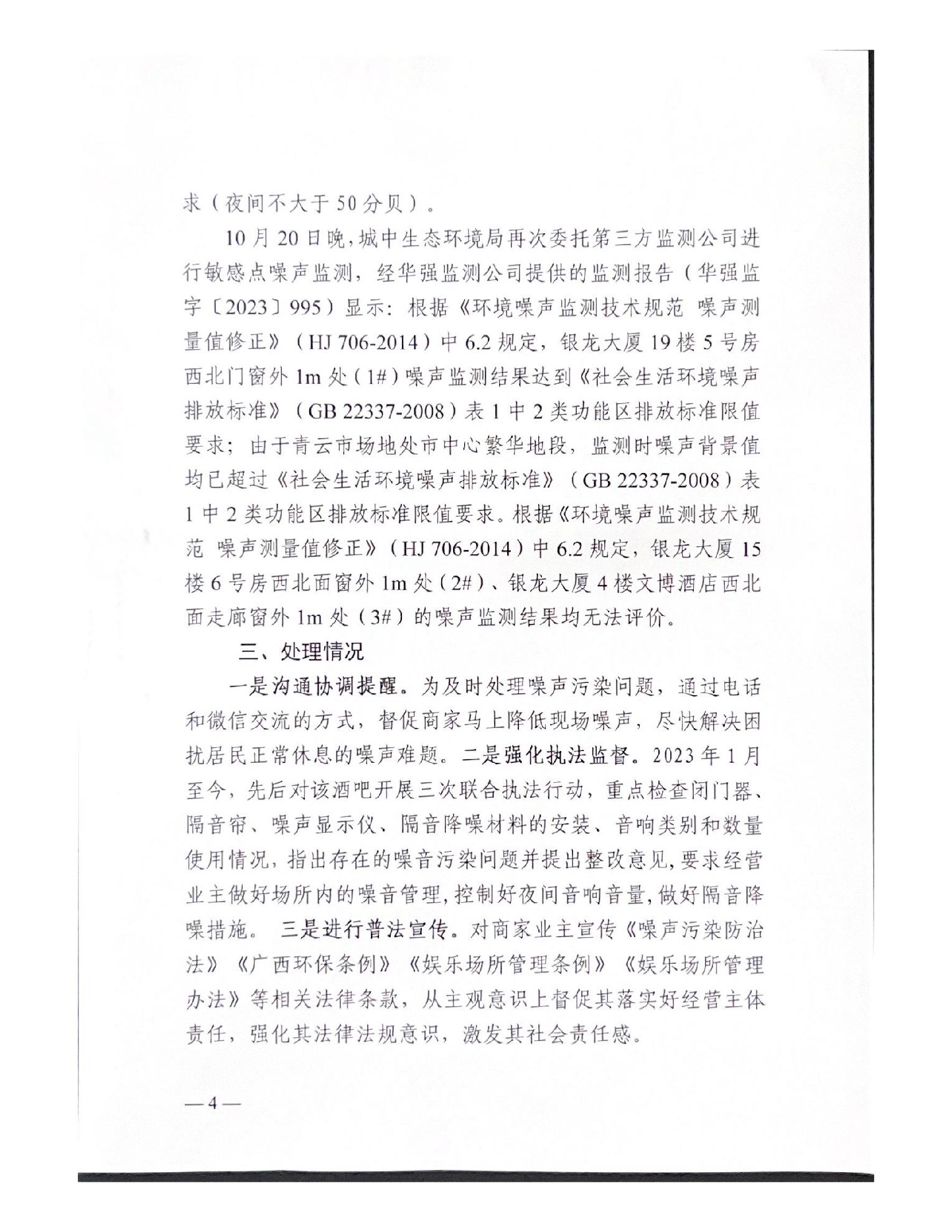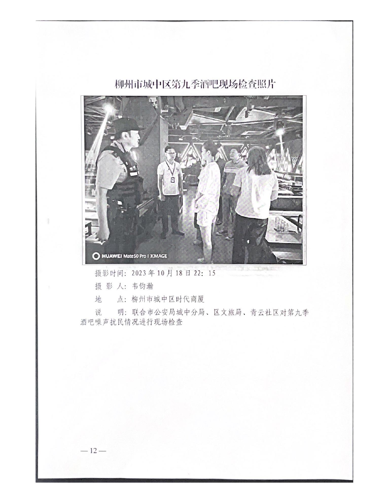 关于报送柳州市城中区时代商厦第九季酒吧噪声扰民问题(第八批编号D2LZ202310170004)调查处理情况的函