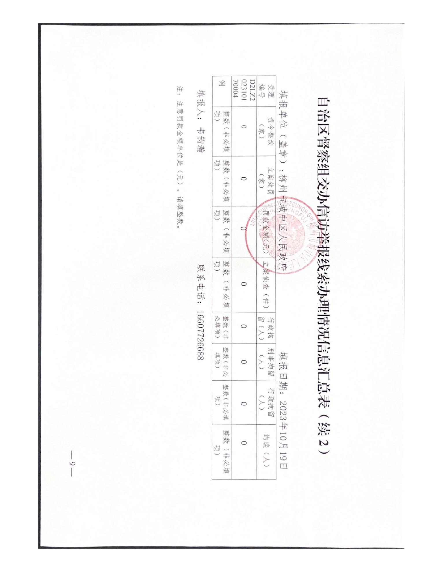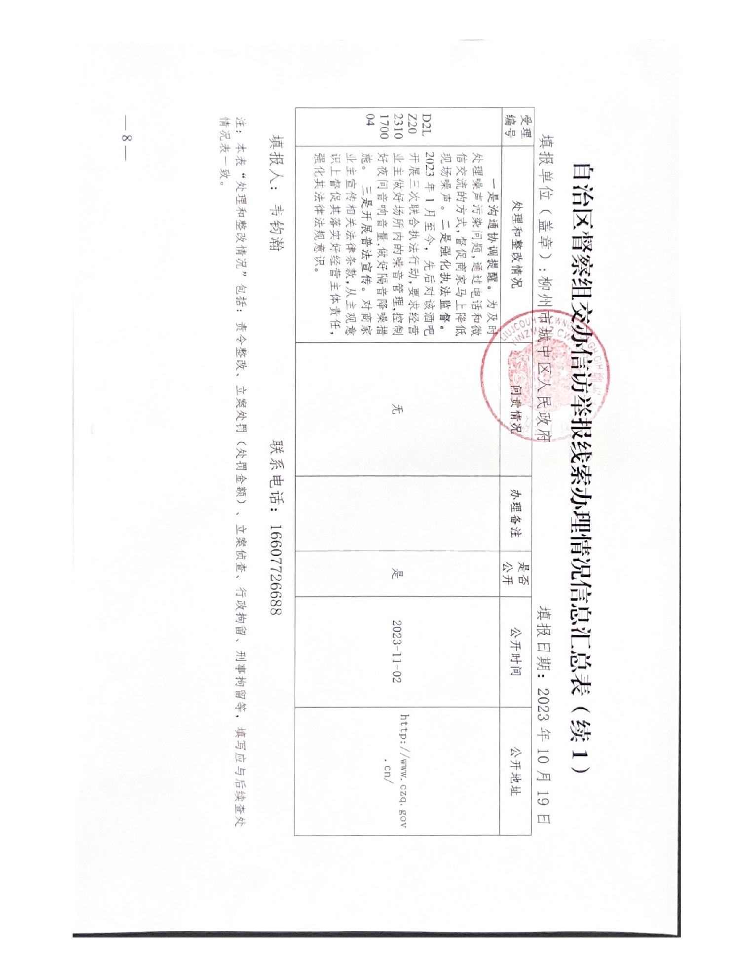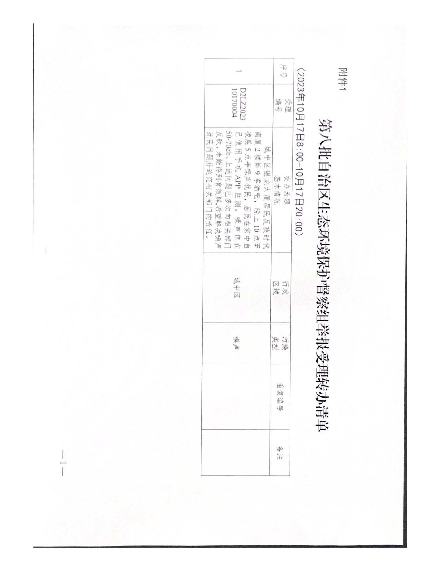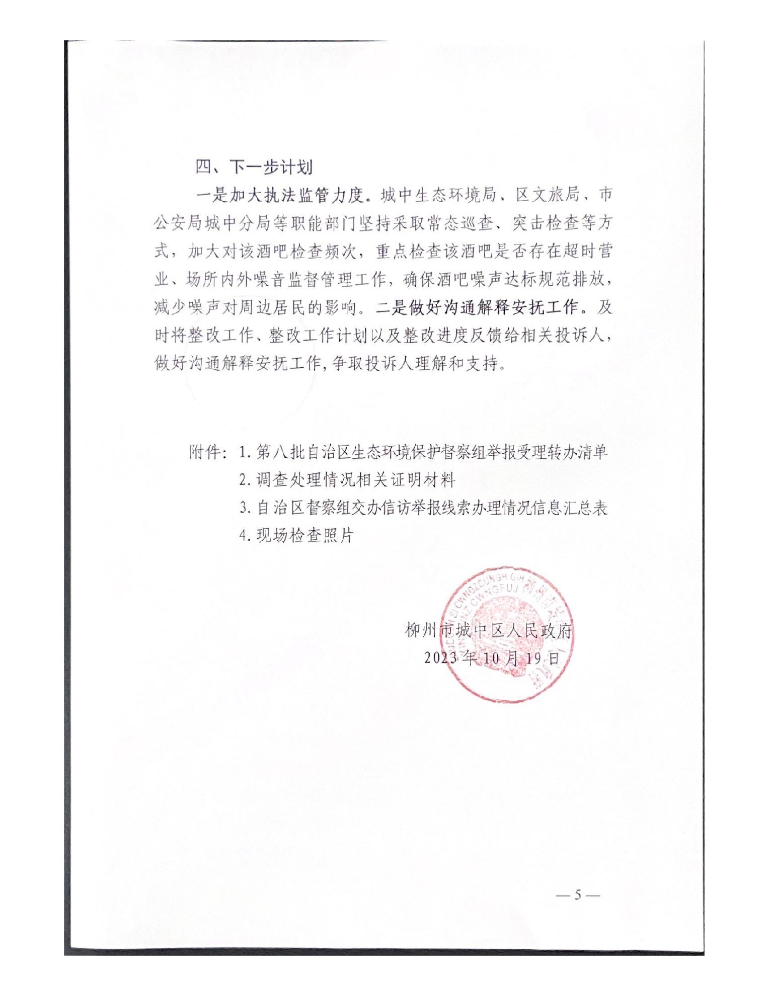 关于报送柳州市城中区时代商厦第九季酒吧噪声扰民问题(第八批编号D2LZ202310170004)调查处理情况的函