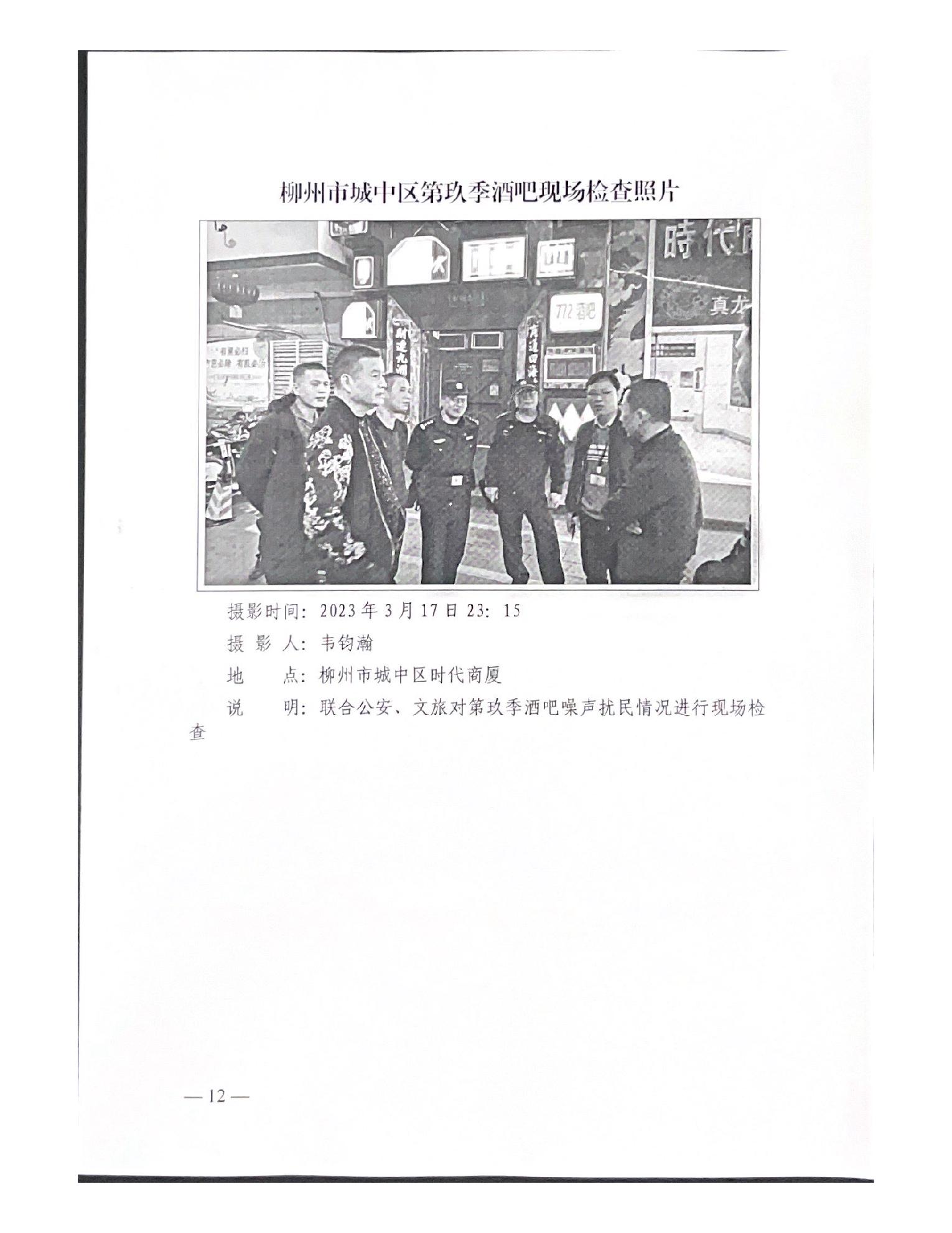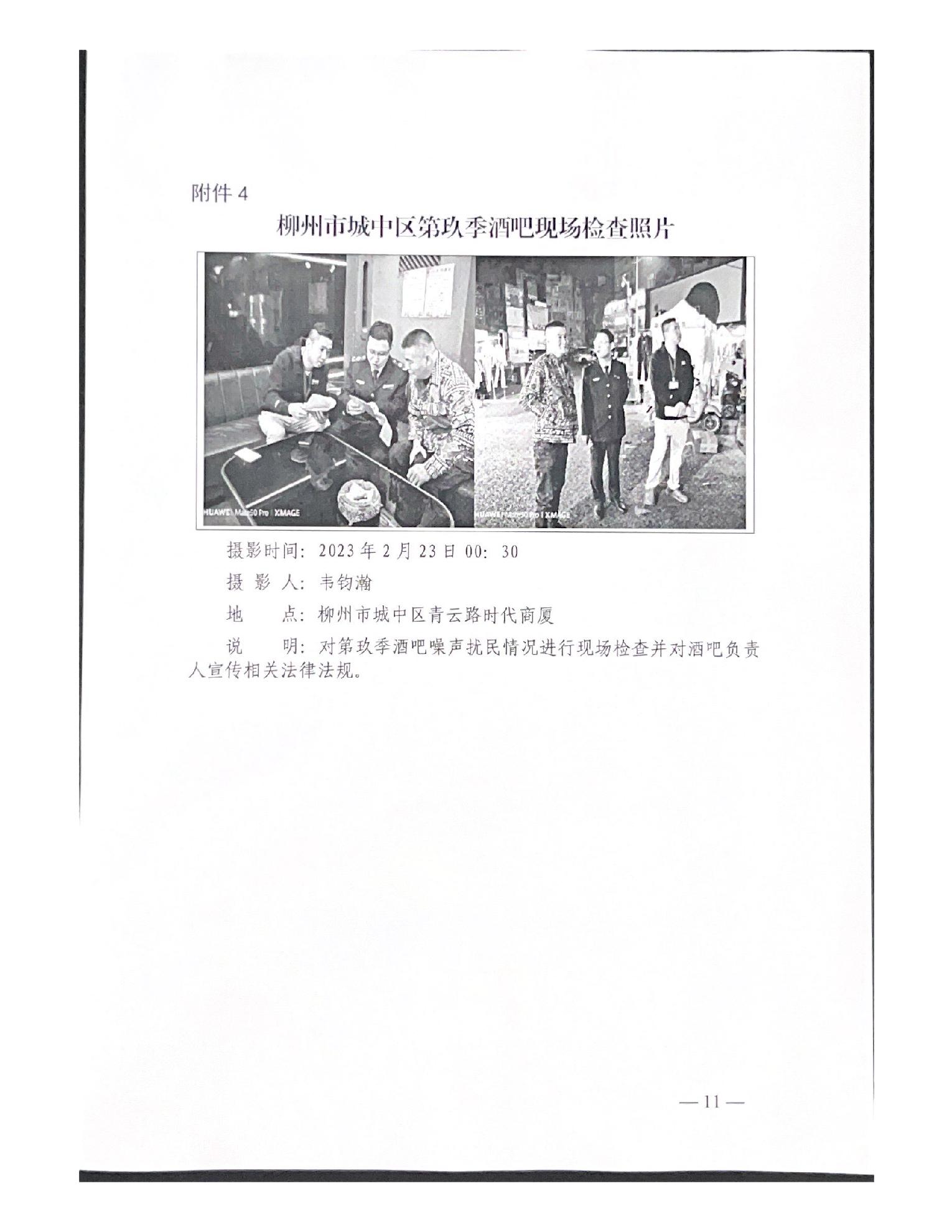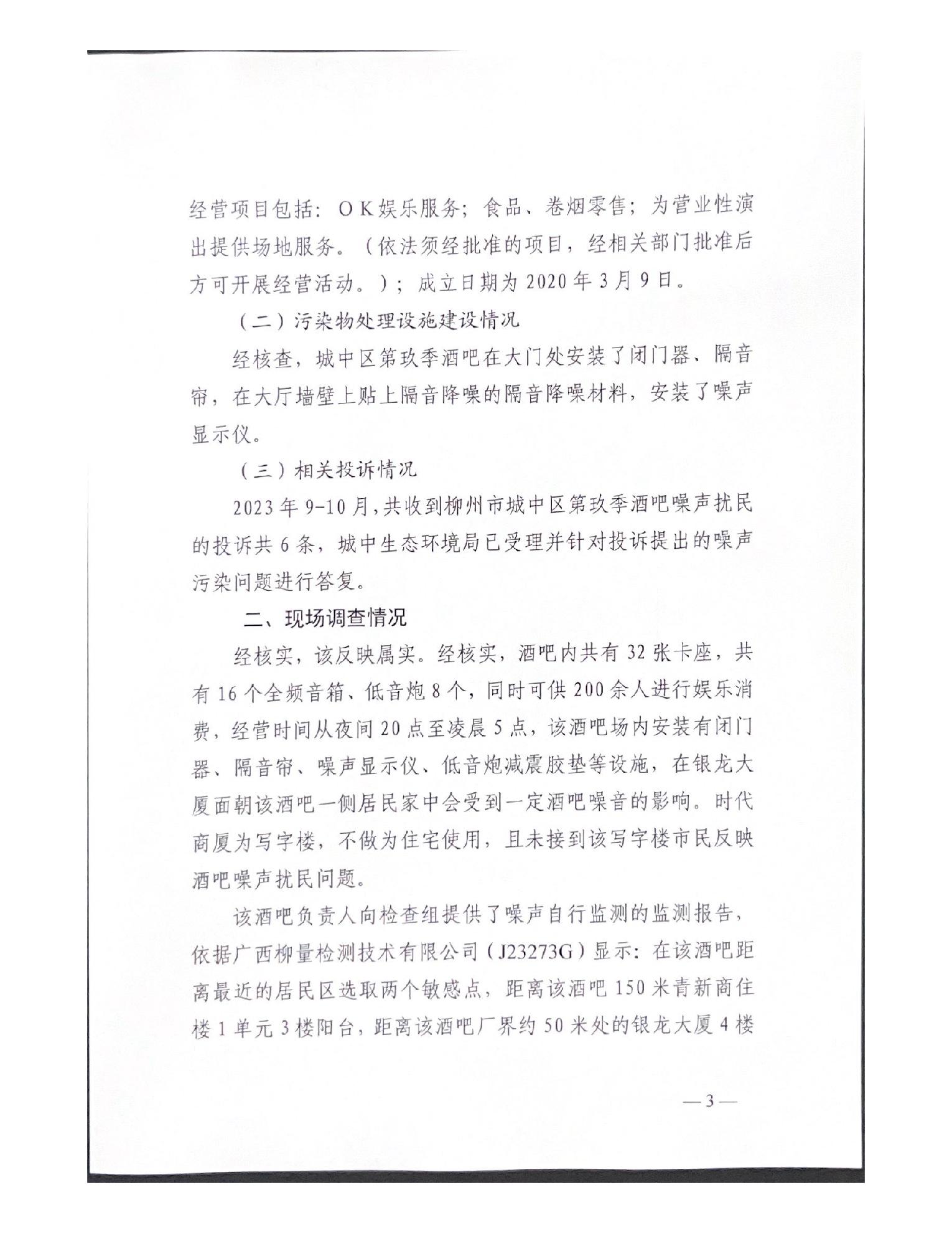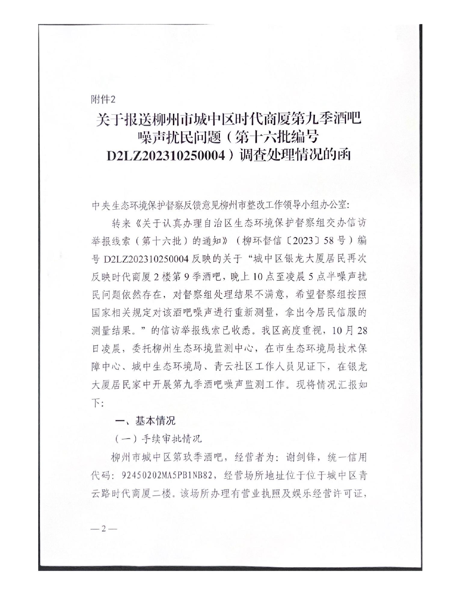 关于报送柳州市城中区时代商厦第九季酒吧噪声扰民问题(第十六批编号D2LZ202310250004)调查处理情况的函