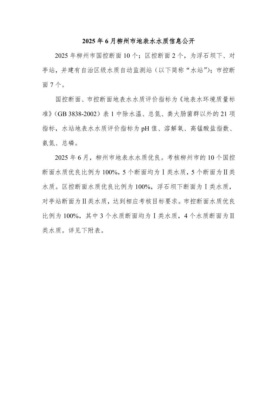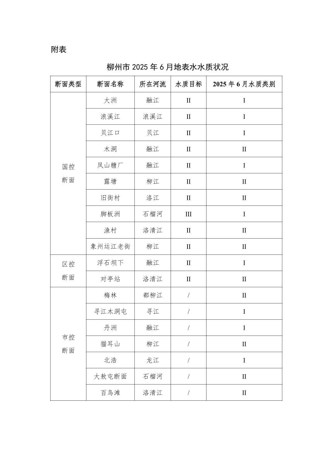 2025年6月份柳州市地表水质量报告