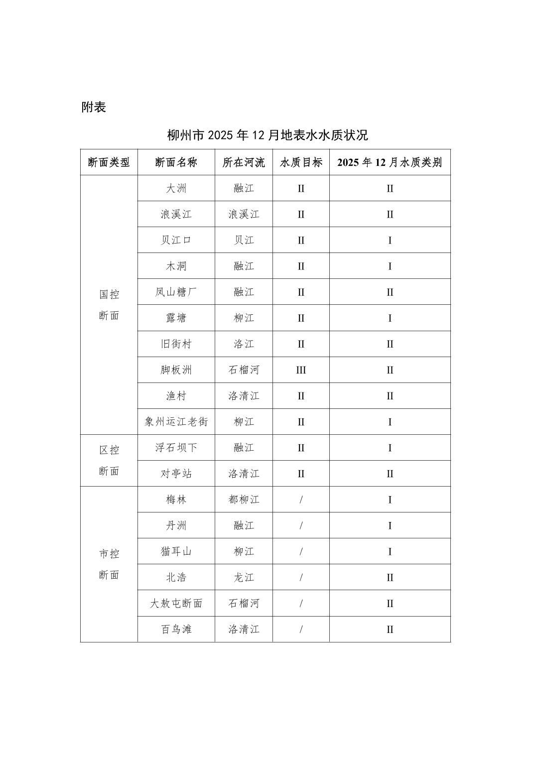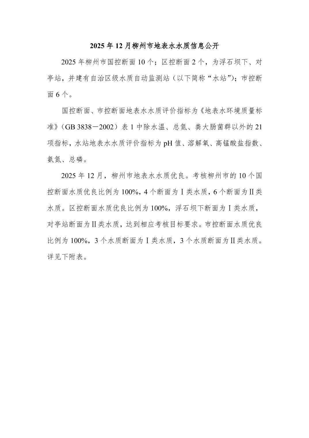 2025年12月份柳州市地表水质量报告