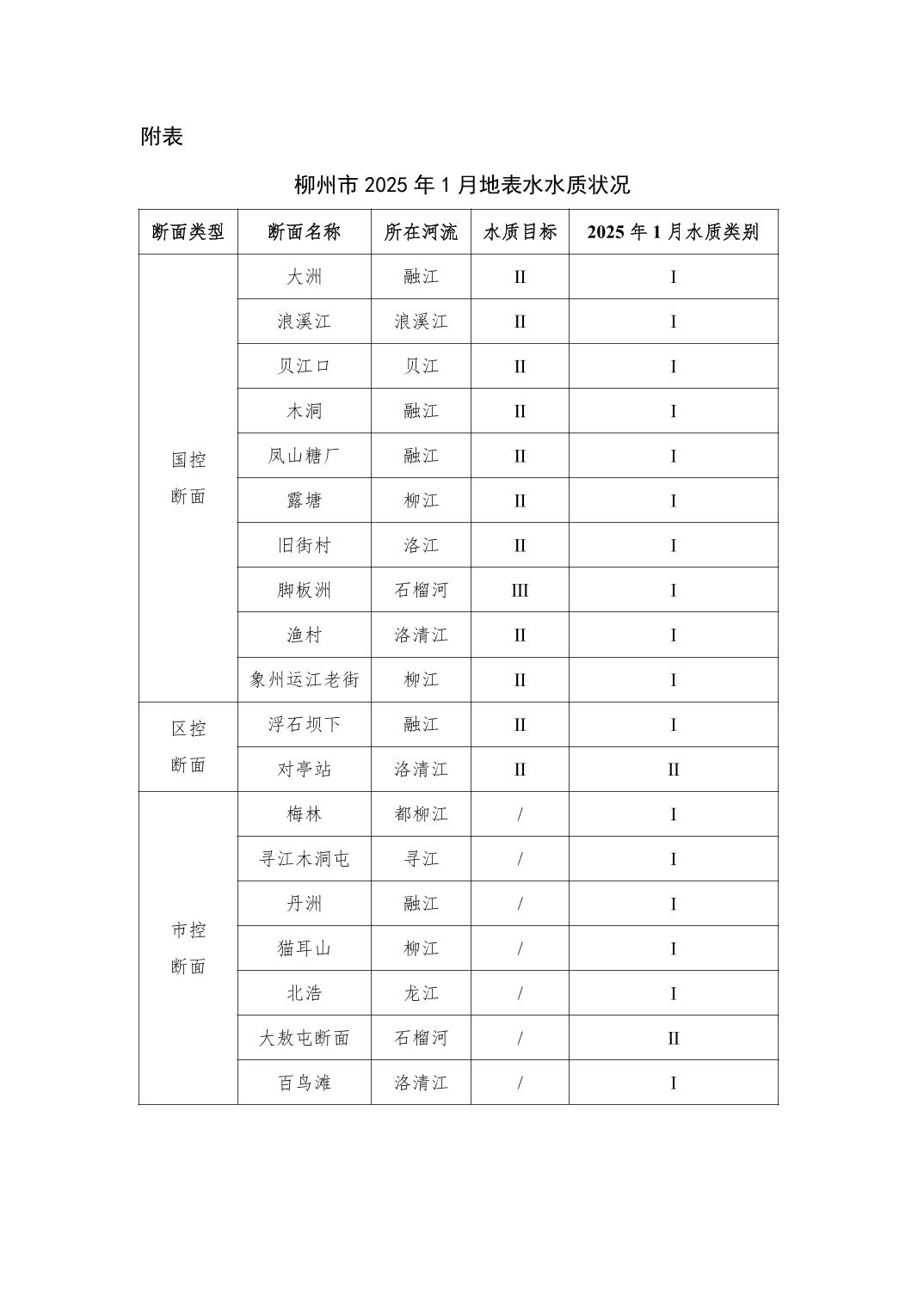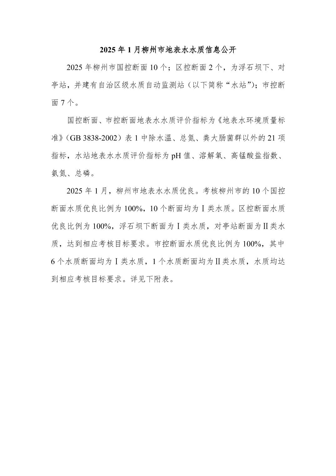 2025年1月份柳州市地表水质量报告