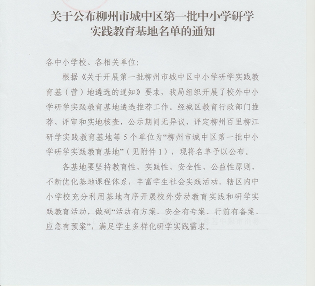 关于公布柳州市城中区第一批校外中小学劳动教育实践基地名单的通知