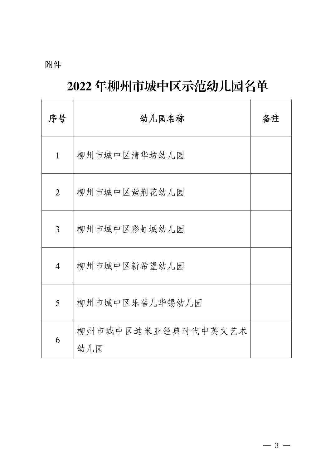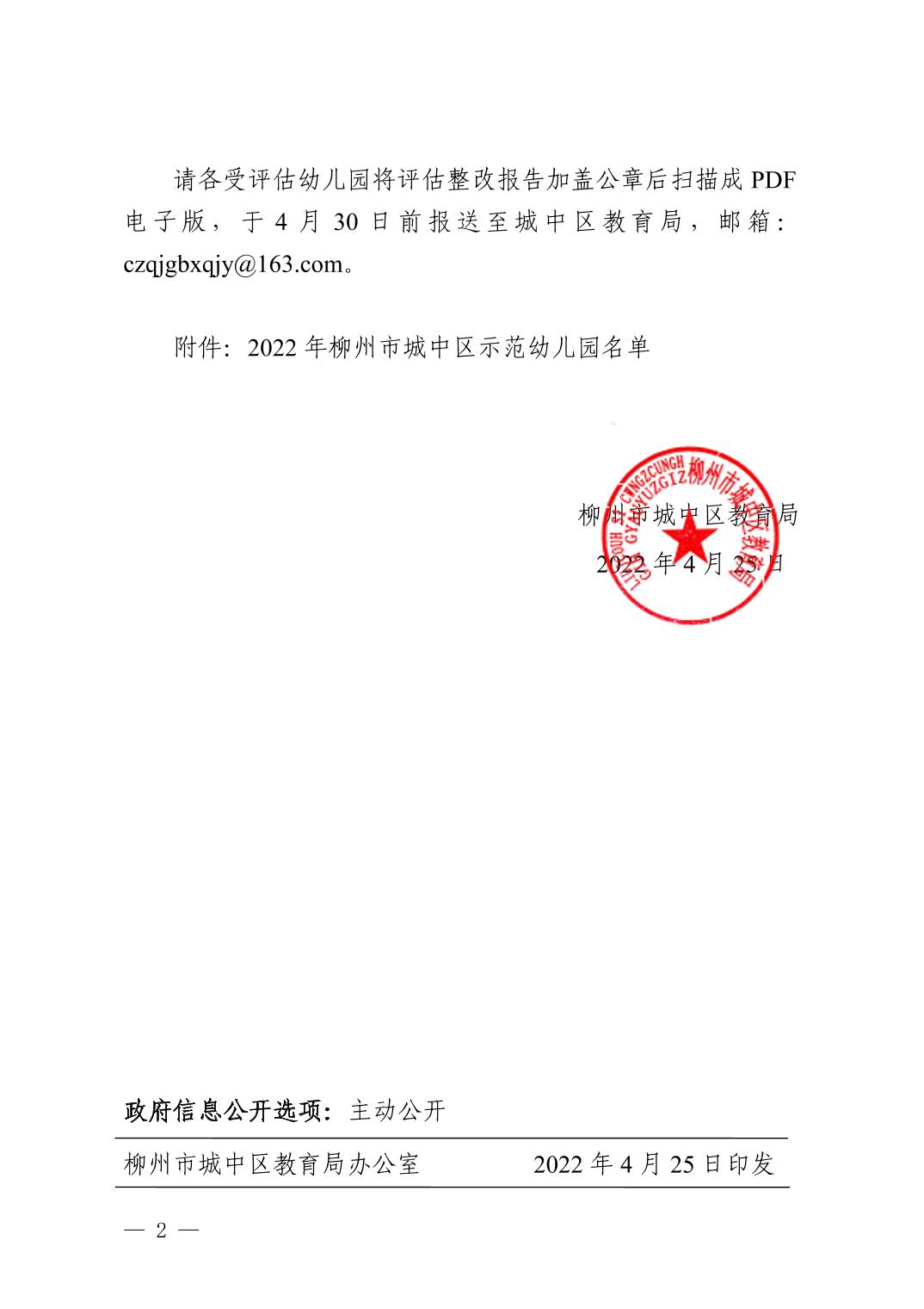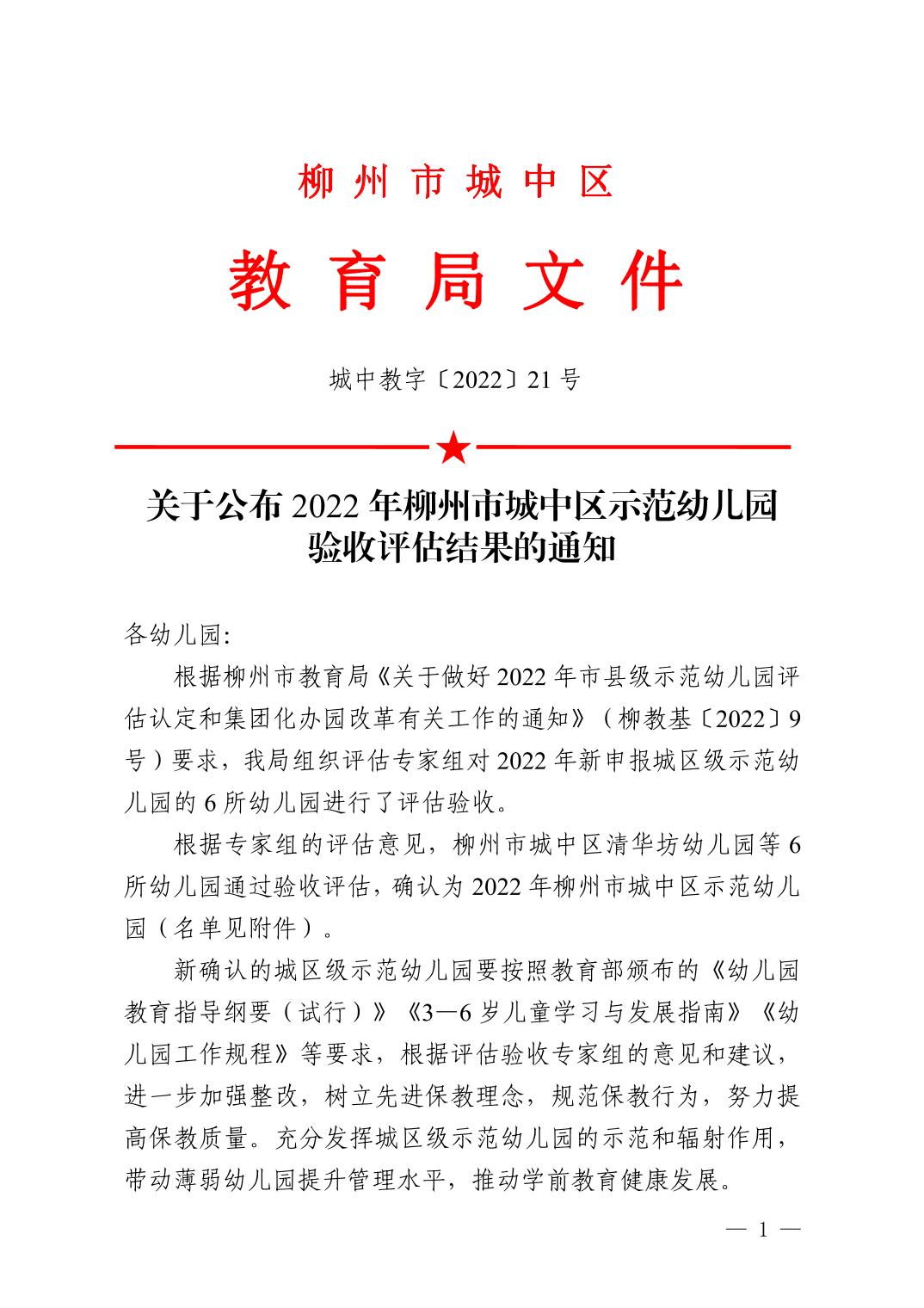 城中教字〔2022〕21号城中区教育局关于公布2022年柳州市城中区示范幼儿园验收评估结果的通知