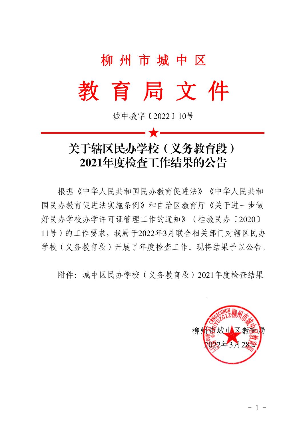 城中教字〔2022〕10号城中区教育局关于辖区民办学校(义务教育)2021年度检查工作结果的公告