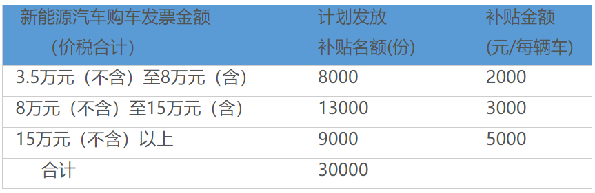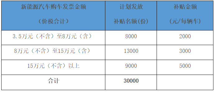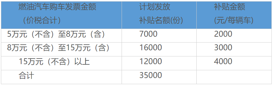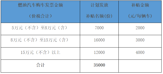 本次活动计划发放燃油汽车购车补贴名额共35000份,新能源汽车购车补贴名额共30000份,一次性投放所有名额,名额有限,先领先得,领完即止。活动期间,每名消费者仅限申请1次补贴(燃油汽车购车补贴或新能源汽车购车补贴仅可申请其中之一)。
