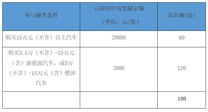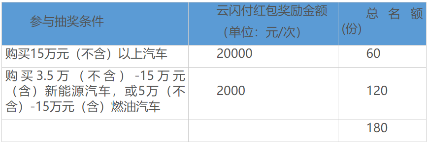 活动期间,在参与活动的汽车销售企业购买3.5万元(不含)以上乘用车新车(新能源汽车)或5万元(不含)以上乘用车新车(燃油汽车),并将相关资料(购车发票、行驶证、购车刷卡小票等)上传至活动平台的个人消费者,可参与购车幸运抽奖活动。活动期间,抽奖活动分3次共计抽取180名中奖消费者,每名消费者至多仅可中奖1次,奖项设置如下:
