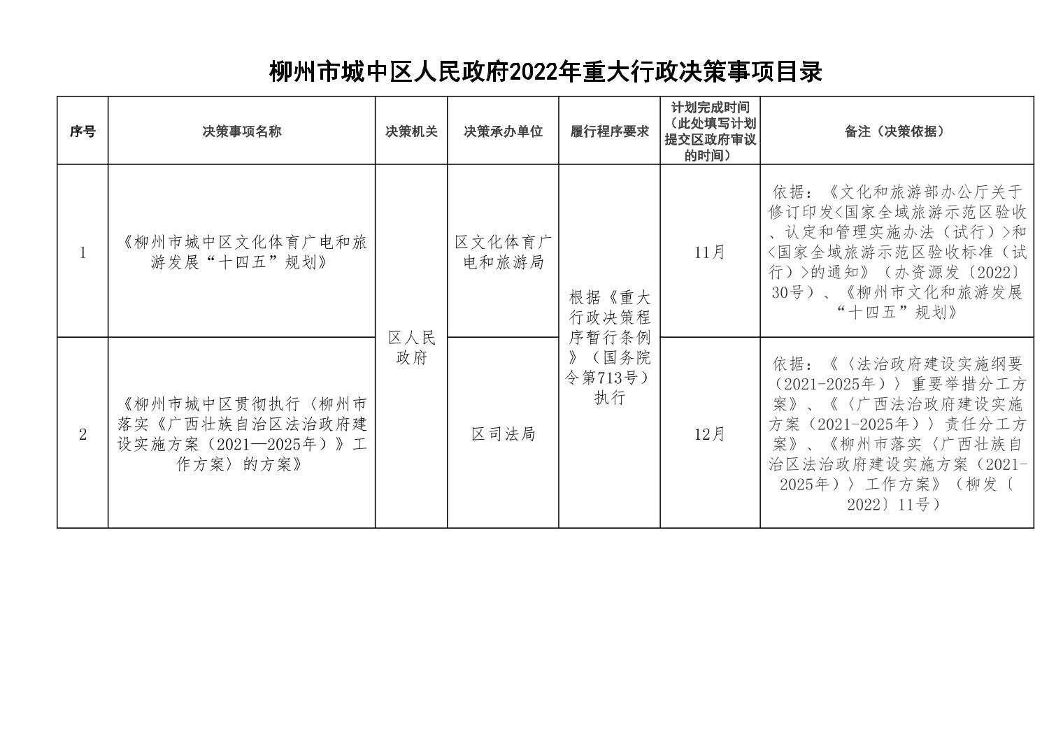 柳州市城中区人民政府2022年重大行政决策事项目录