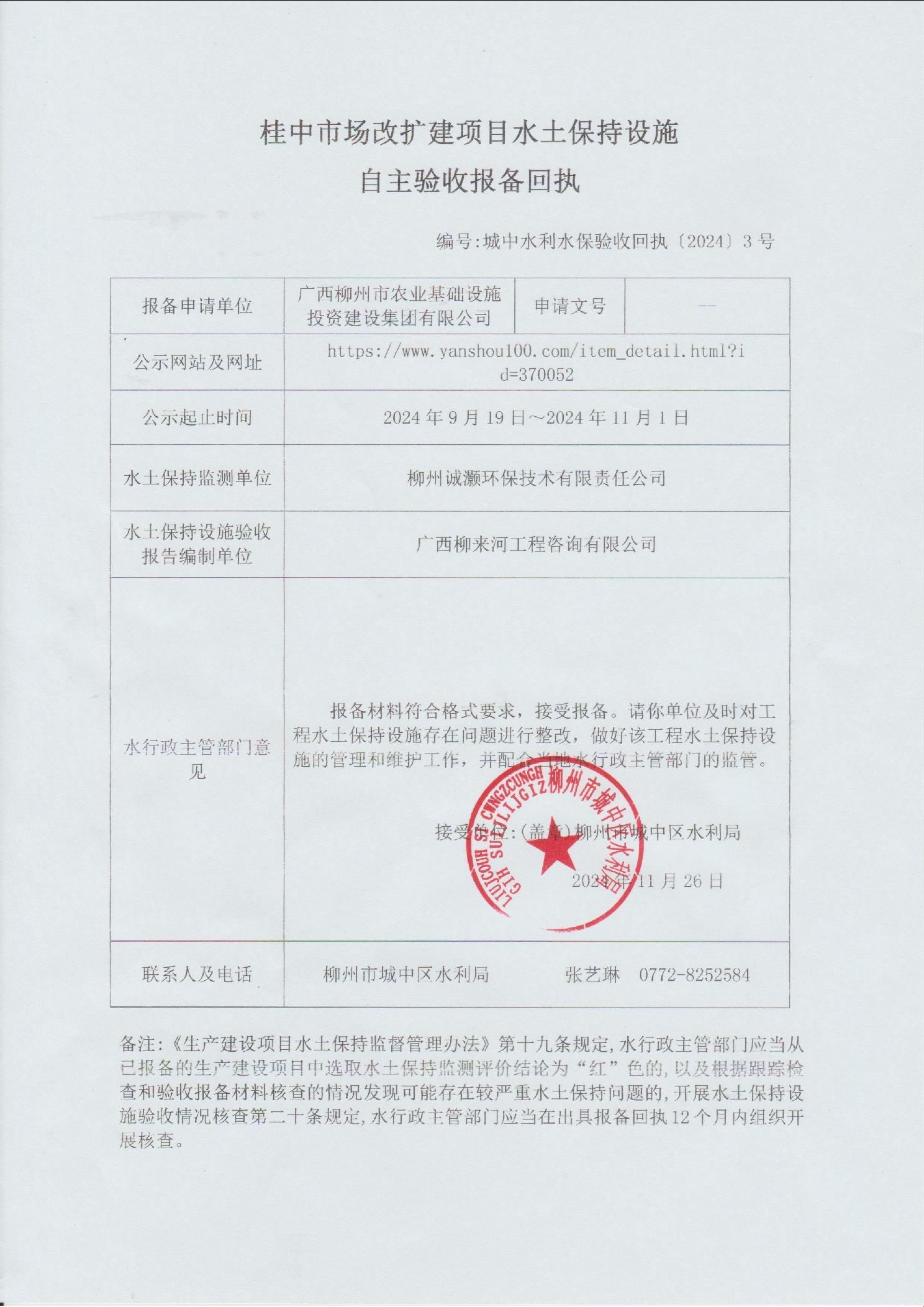 桂中市场改扩建项目水土保持设施自主验收报备回执