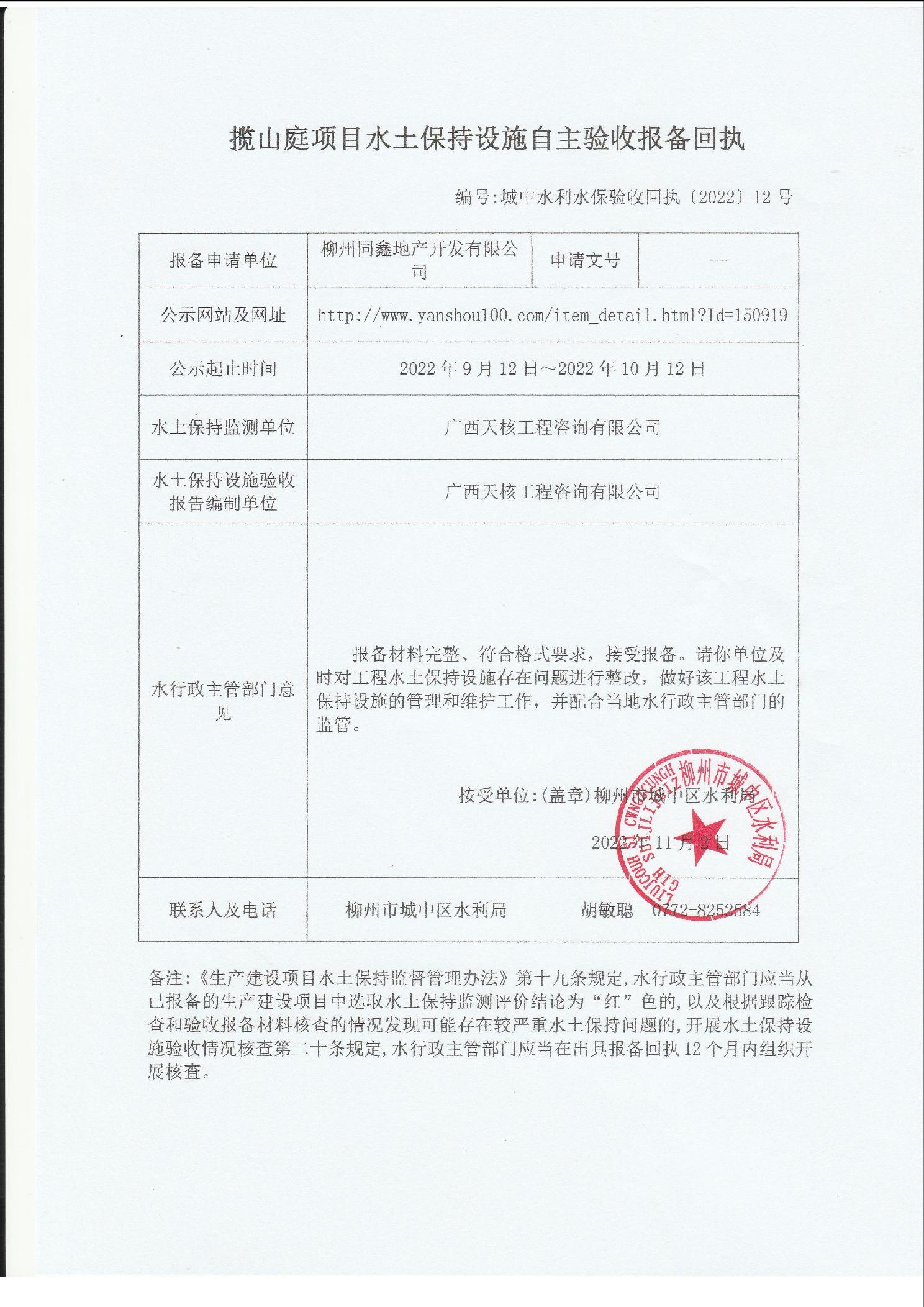 揽山庭项目水土保持设施自主验收报备回执